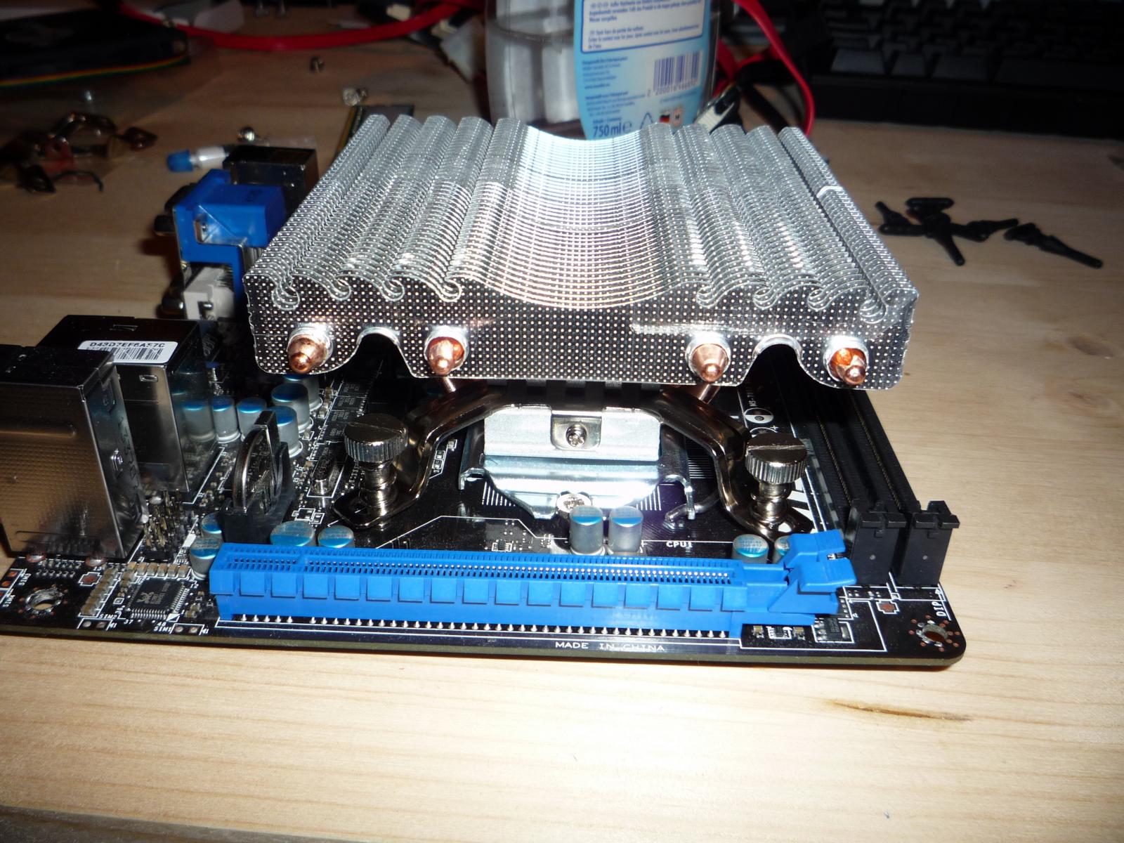 Mainboard mit boxed Kühler kurz eingelegt. Das Netzteil fehlt hier noch aber es wird ersichtlich, dass man auch größere Towerkühler verwenden kann: