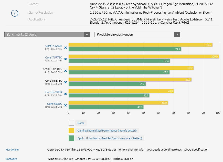 super, der i7 6700 kostet 20€ mehr, dann wird da noch ein möglichst großer kühler für rund 40€ drauf gepackt um die höhere abwärme irgendwie noch leise abzuführen, zu guter letzt dann noch mal 20€ aufpreis für das mainboard und es bleibt ein preisunterschied von gerade mal 0€ zum schnelleren und sparsameren i7 5775c. so spart man geld.