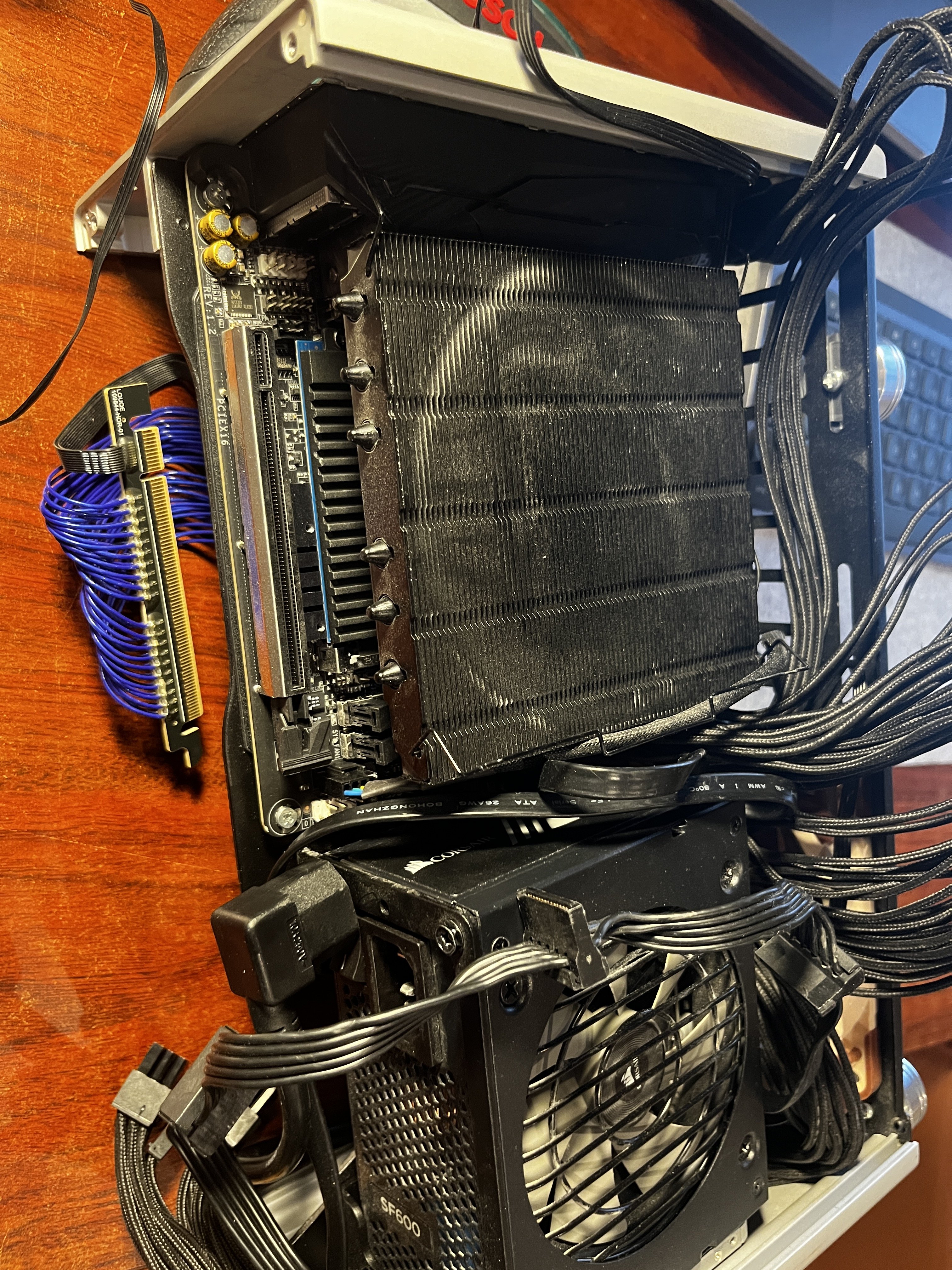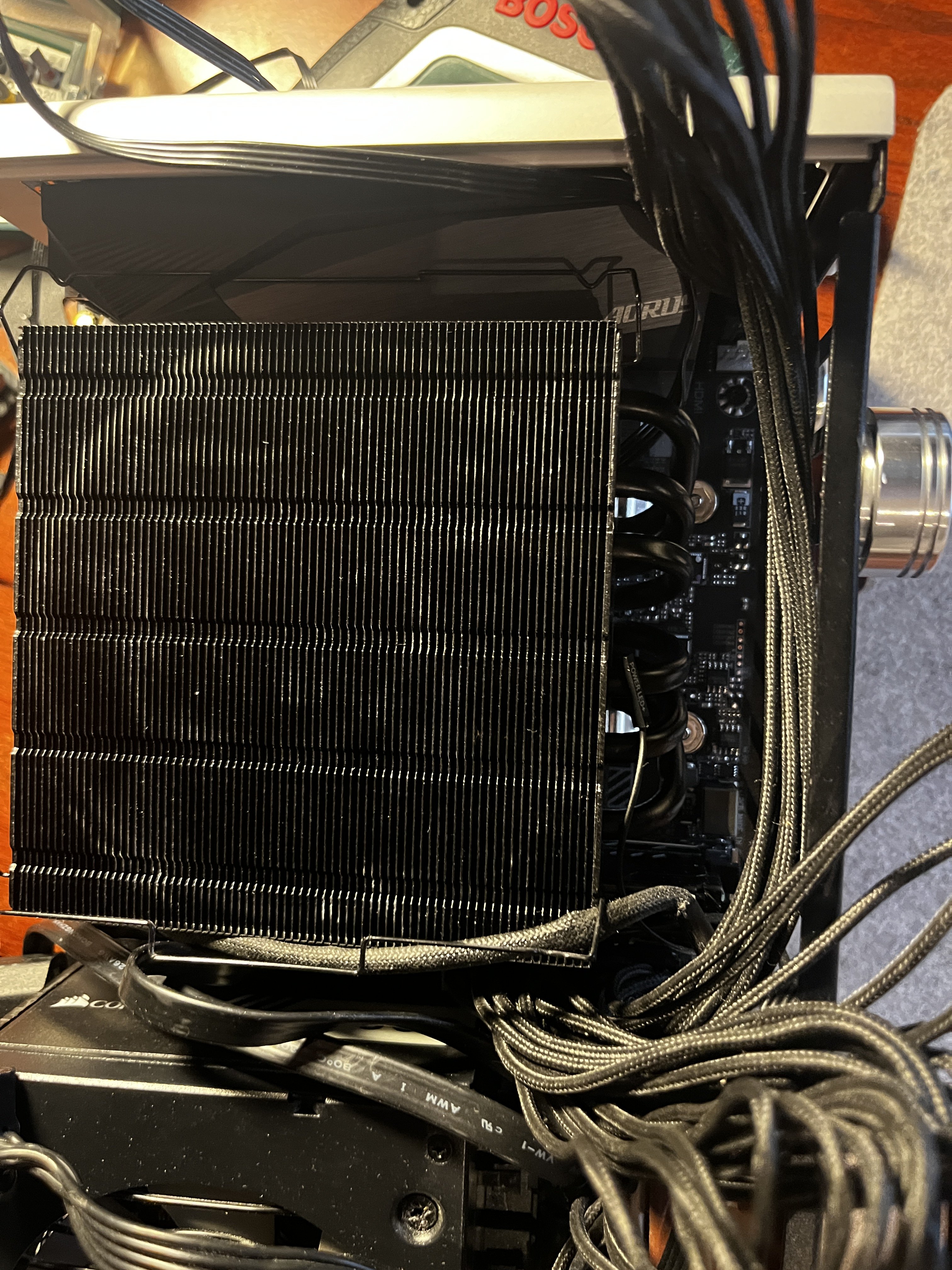 Jetzt geht der Noctua Kühler, der nach unten rausblasen soll und unter dem Netzteil sitzt, nicht mehr (Seiten rein, unten raus ist wohl das beste bei solchen Cases), aber alles andere scheint stabil zu laufen und die Temparaturen sehen normal aus für den Formfakor