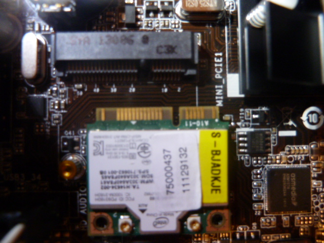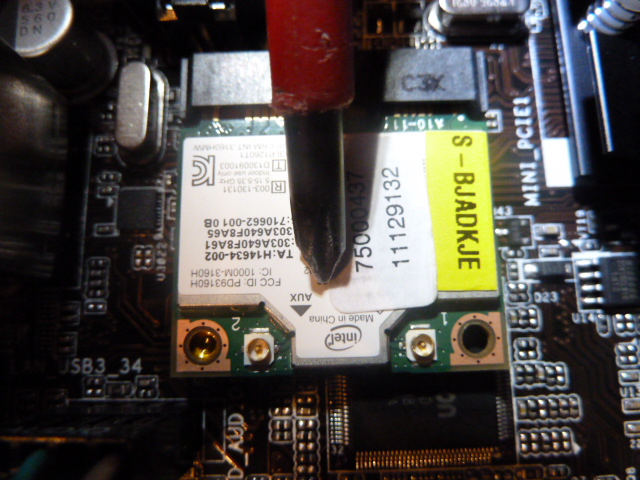 Versuch mal die rot Markierte Schraube aus dem Board rauszudrehen (keine Gewalt anwenden), mini-PCIe Karte rein, schraube wieder reindrehen von oben.