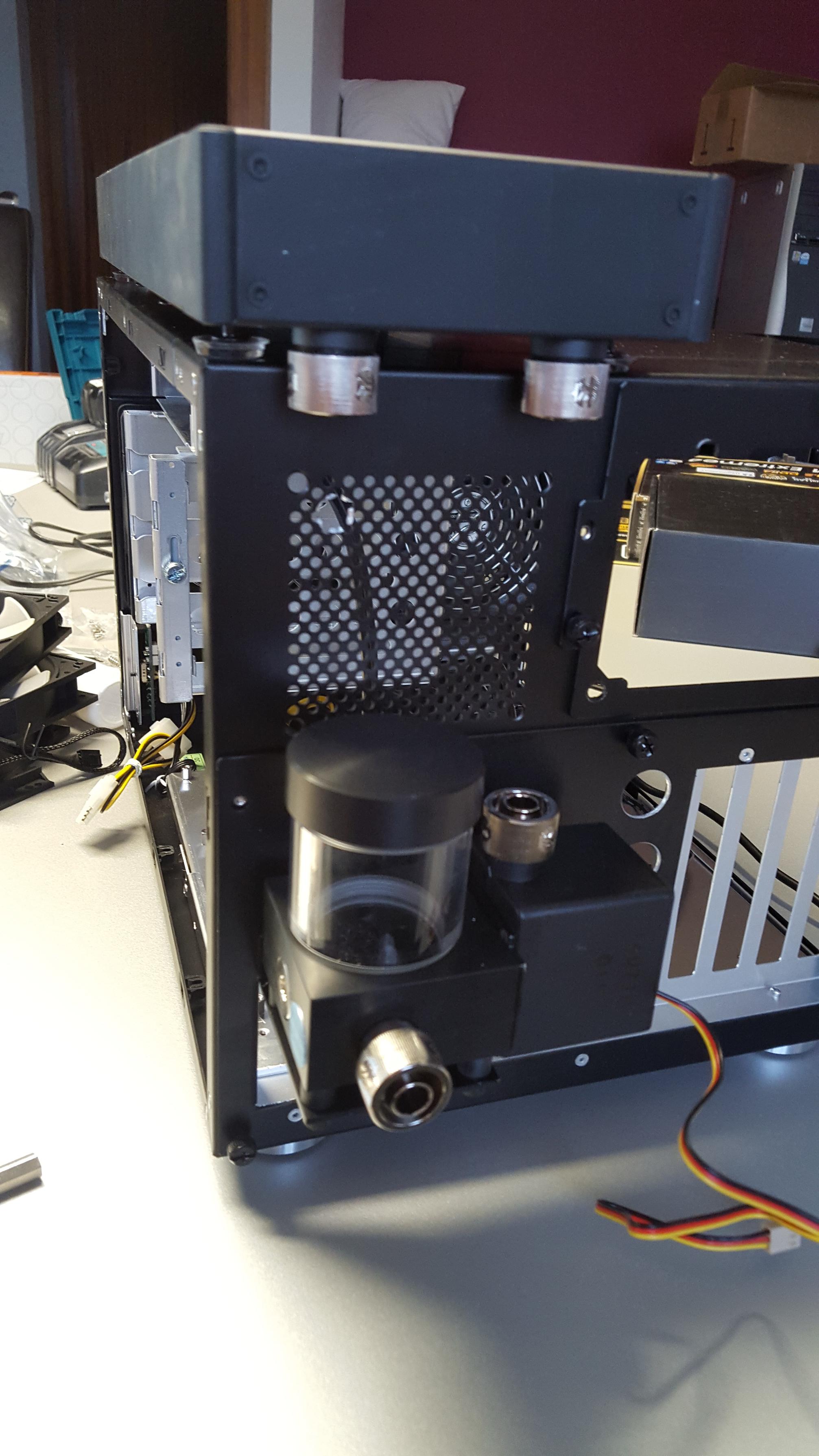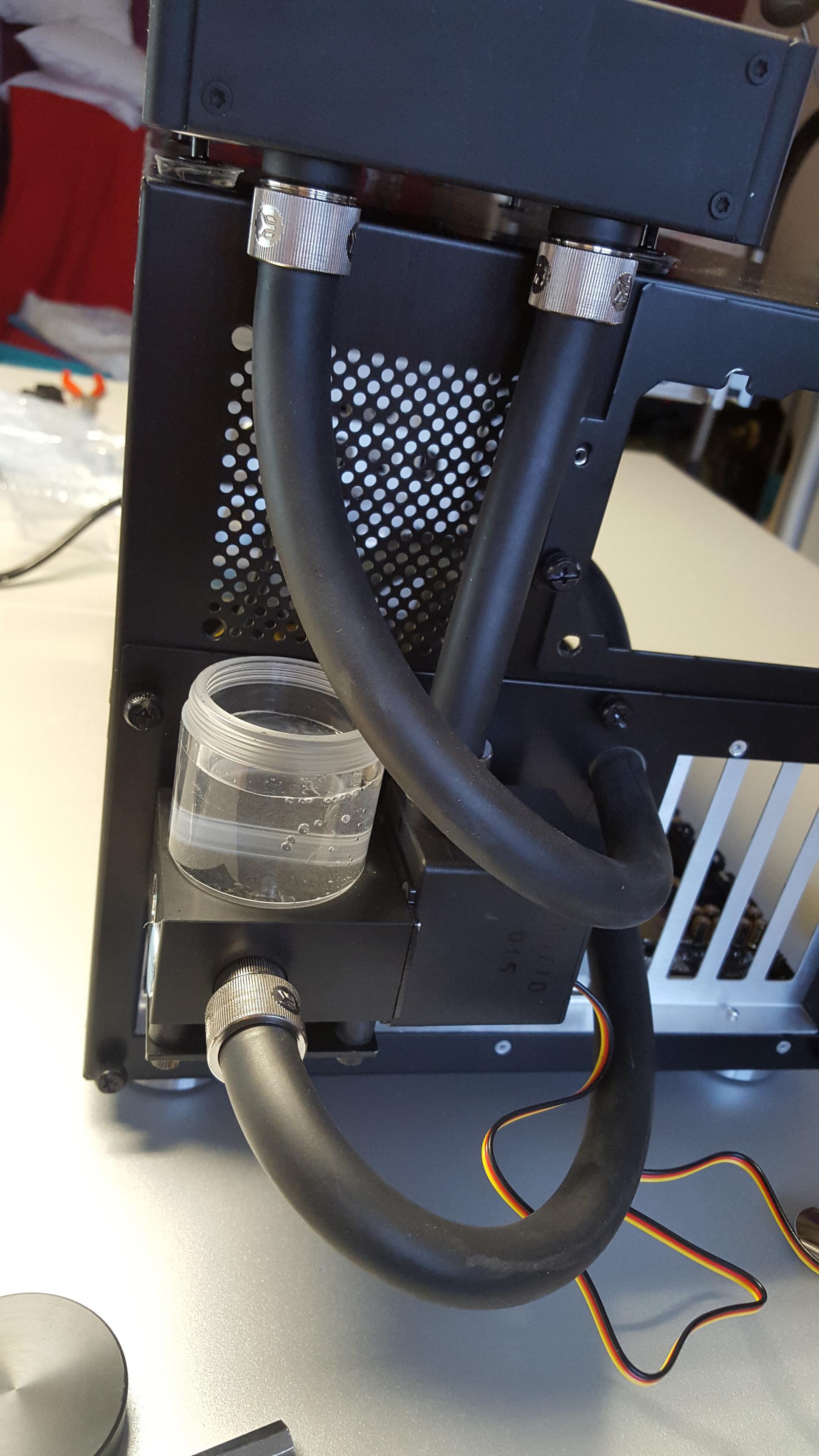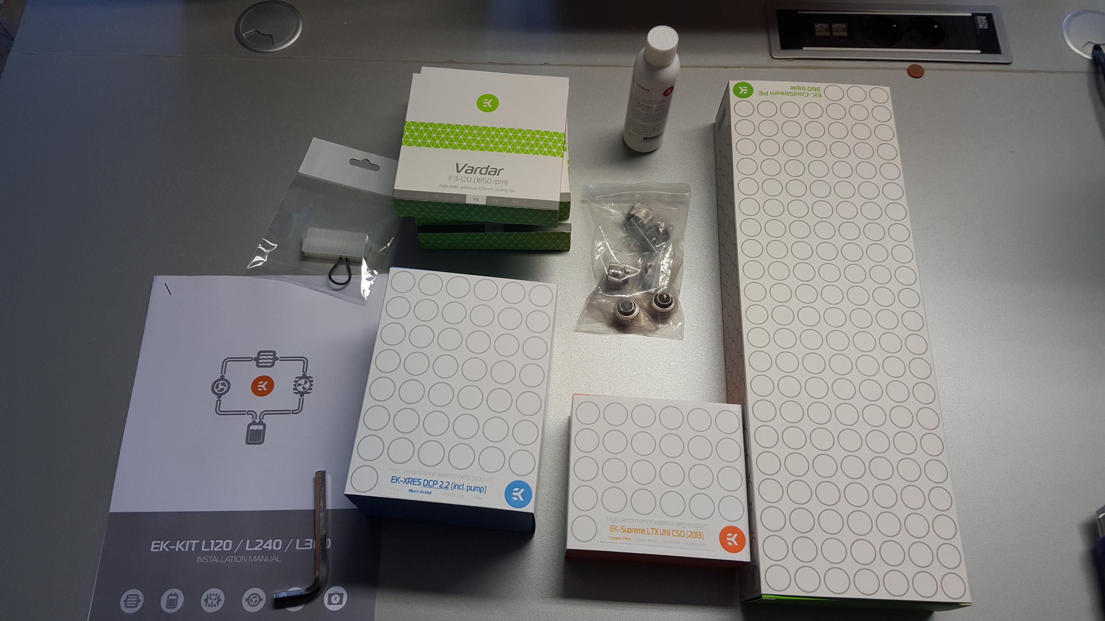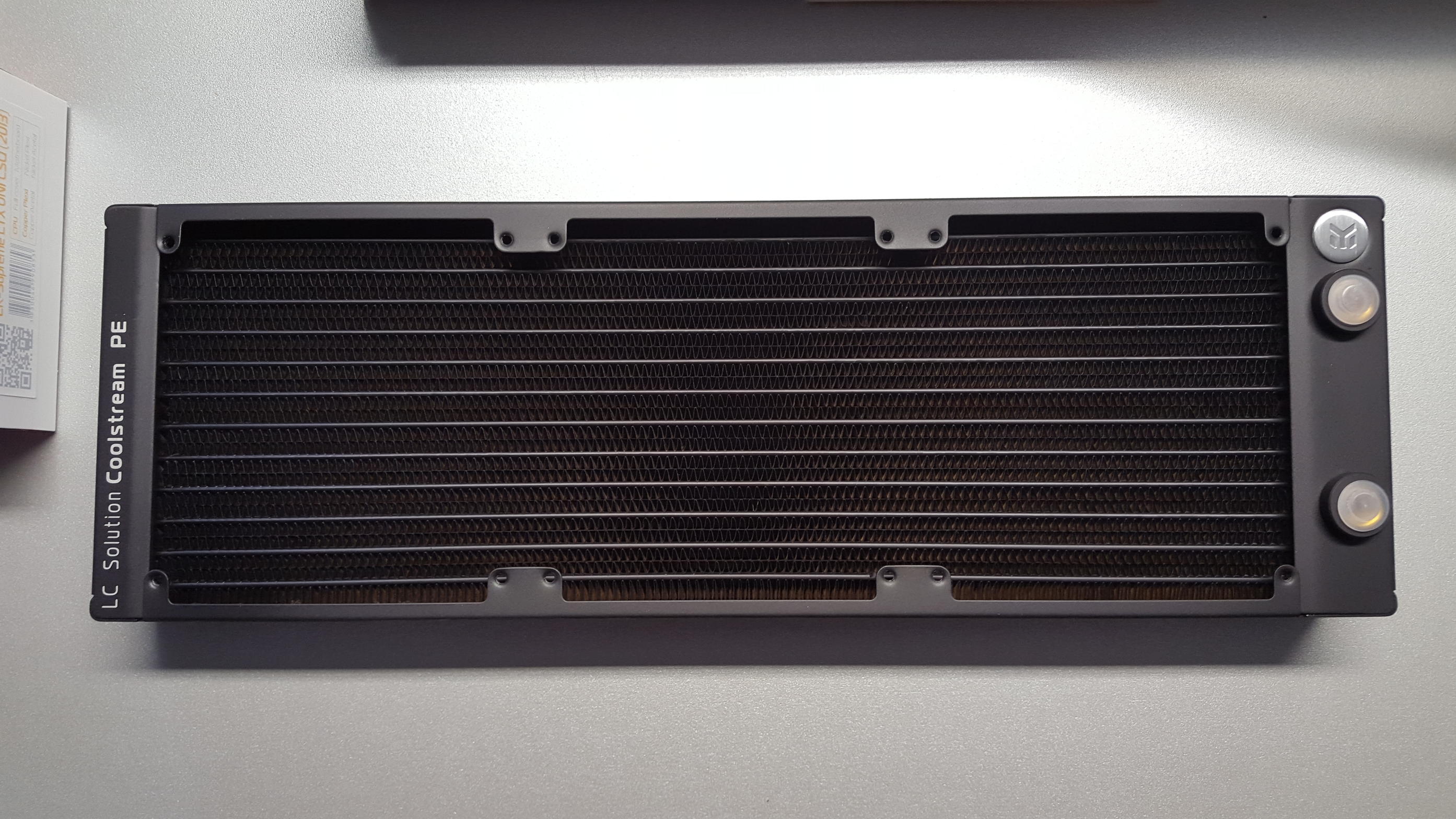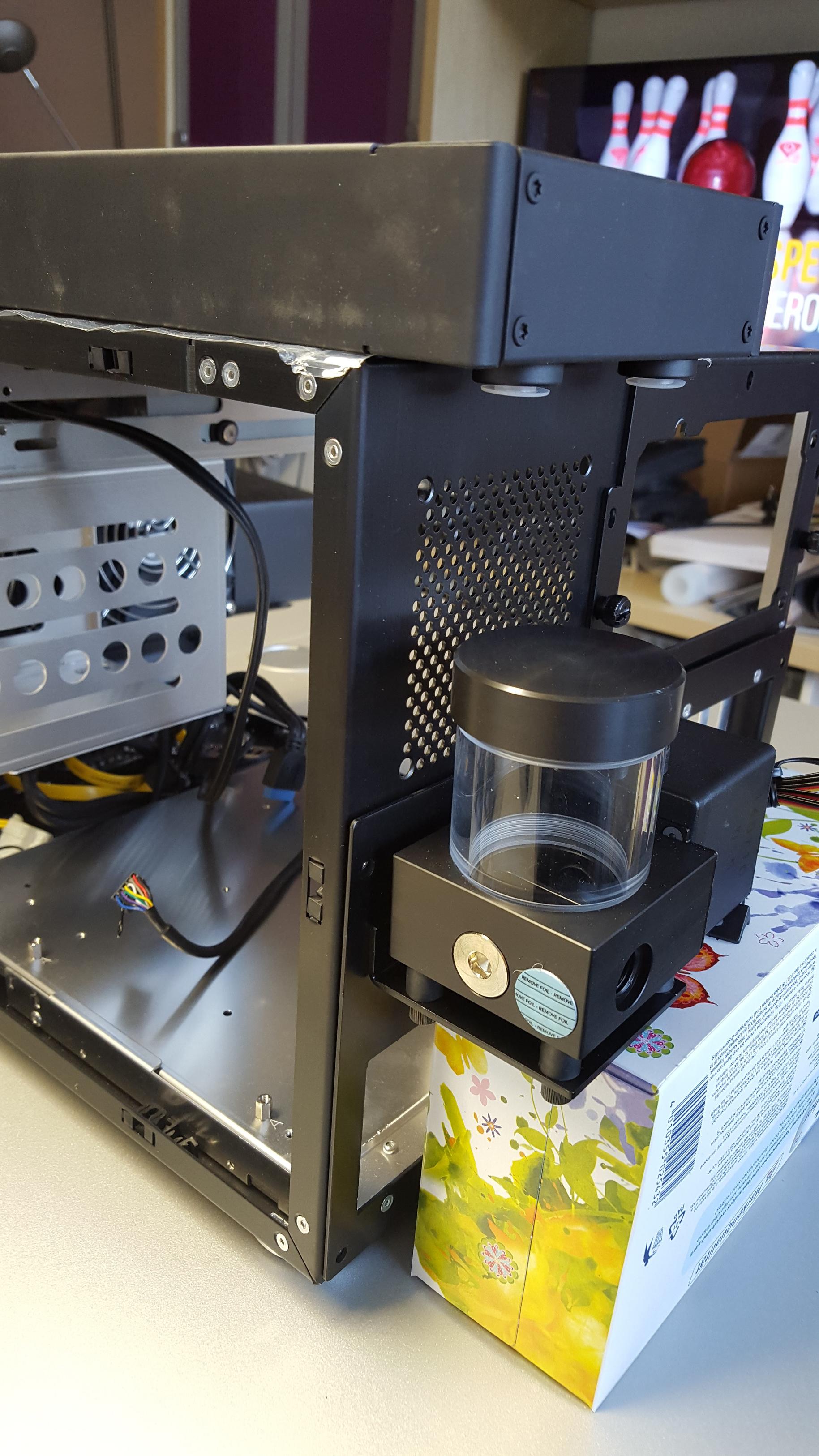 Da ich das Gehäuse vorher schon im Betrieb hatte war mir klar das die Wärmeabgabe in so einem kleinen System die größte Gerausforderung wird. Ich liebäugele schon seit Jahren mit einer Wakü. Hier hab ich mich dann auch für ein Kit entschieden welches einen 360er Radiator hat und wegen der Platzverhältnisse den Ausgleichsbehälter mit Pumpe extern montierbar bietet.