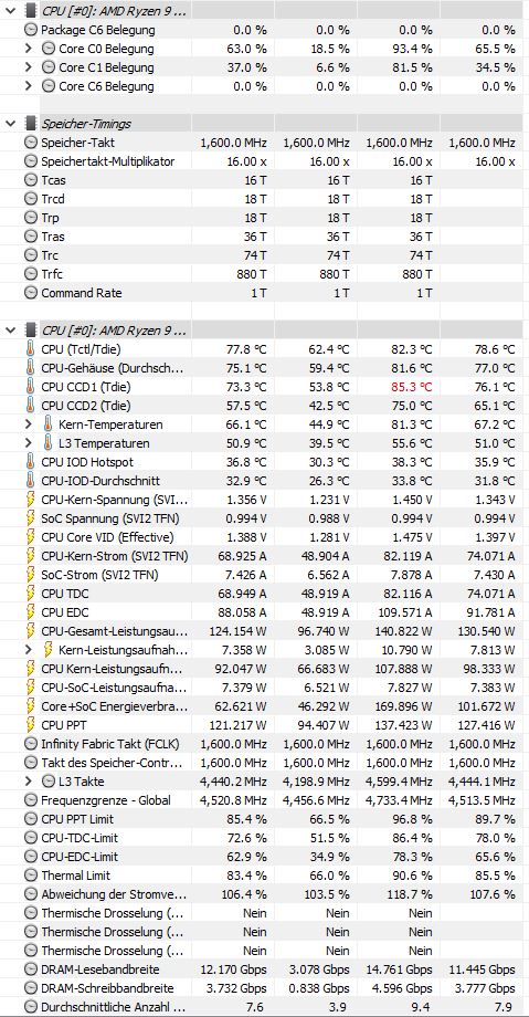 Jede Mal, wenn ich merke das es einen lagg gab, und ich auf hWInfo blinzle, sehe ich, dass die CPU Temps ( CPU Tctl/Tdie // GPU-Gehäuse und CPU CCD1 (Tie) ) kurz in den roten Bereich springen (85°C+). Danach gehen sie wieder knapp 5°C runter und alles läuft flüssig.