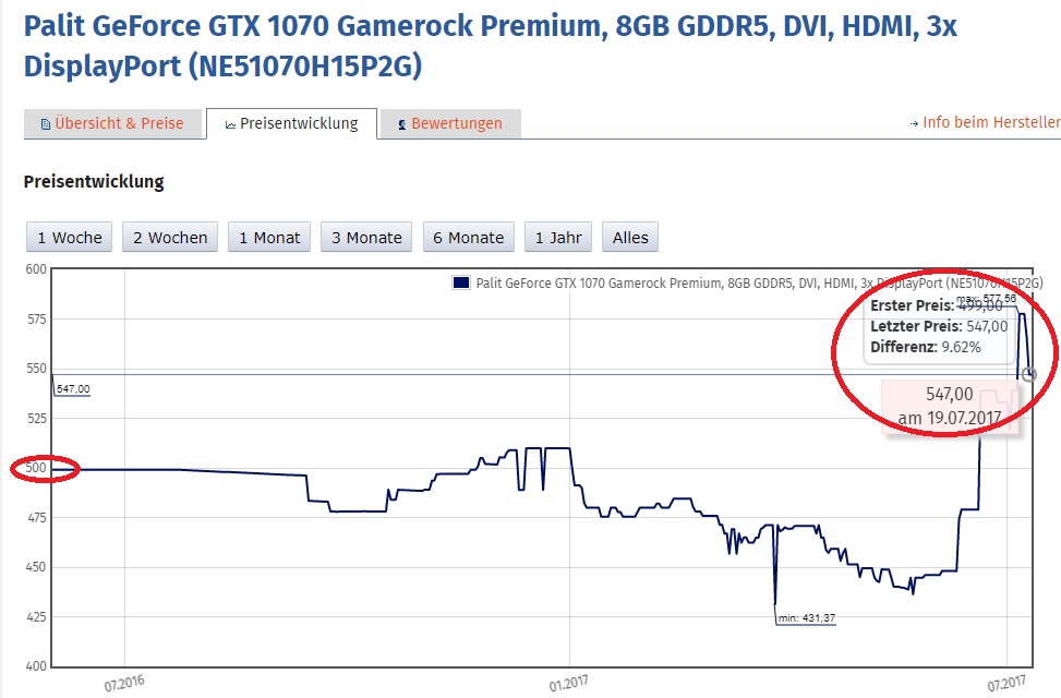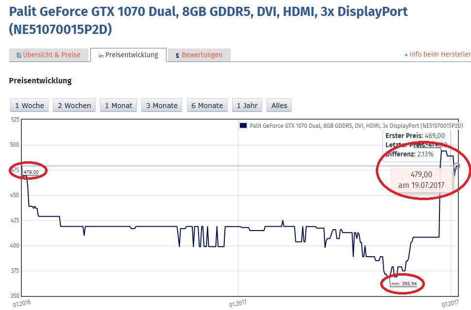 Hab gerade mal geschaut, nach einer recht "normalen" GTX 1070 (als Beispiel Palit). Der Preisverlauf ist schon erstaunlich, nachdem er ab Start bei um die 469 stetig Richtung 380 gefallen ist und der Mining Boom den GPU Markt getroffen hat, ist die Karte nun bei 479€.