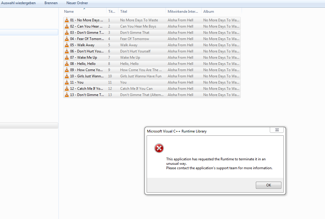 bekomme die im Anhang befindliche Fehlermeldung wenn ich mehrere Musiktitel markiere um dann alle abspielen zu lassen.