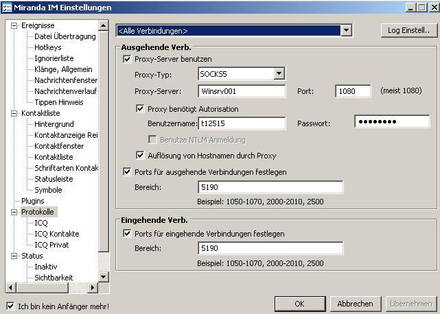 entweder schaltest du für jedes protokoll im jana-server das entsprechende port-forwarding ein, oder du stellst bei den miranda optionen unter "Netzwerk" die proxy-eigenschaften ein.