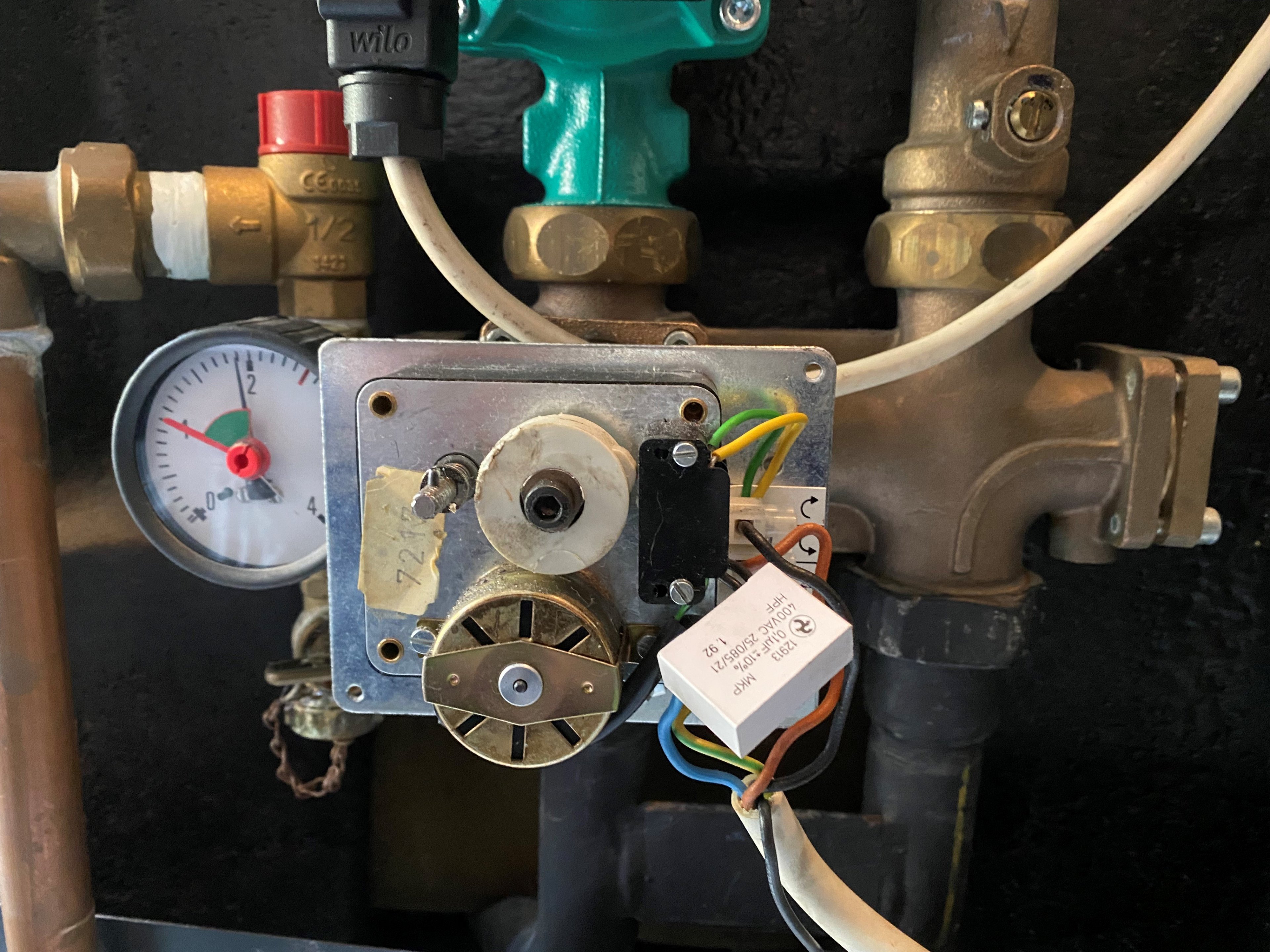 Hierfür wird ein Stellmotor angetrieben welcher, so wie es für mich als Laie aussieht, über zwei Kontakte den Motor links, bzw. rechts rum drehen lässt. So wird der Mischer geöffnet und mehr warmes Wasser wird über die WILO Pumpe in die Fußbodenheizung gepumpt. Wenn ich mich nicht irre und so wie es mir der Heizungsbauer erklärt hat, würde es ausreichen wenn ich eine Art Zeitschaltuhr habe die bei Bedarf den Motor antreibt und den Mischer öffnet und ab einer bestimmten Zeit wieder schließt?