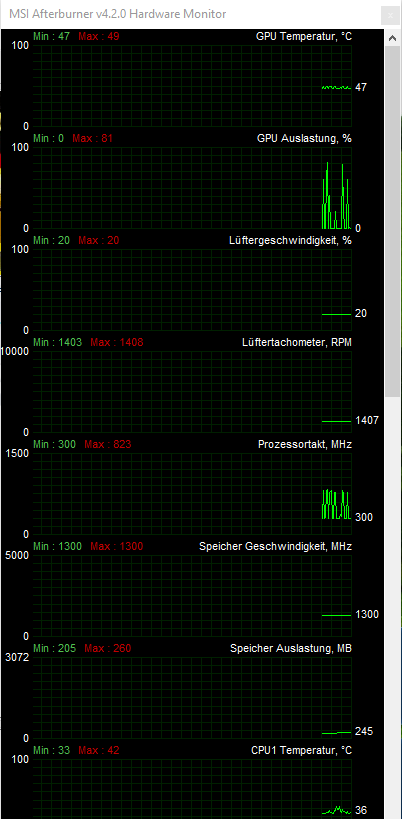 Während der Bildschirm für gut 0,5sec bis 5sec. einfriert, kann ich auf dem 2. Monitor nur sehen, dass die GPU-Auslastung runter geht. Meist so bis 15%, dann schnellt sie wieder hoch bis zum nächsten mal. Wenn man sich nun das angehängte Bild ansieht, dann kann man erkennen, dass die GPU-Auslastung sehr stark schwankt.