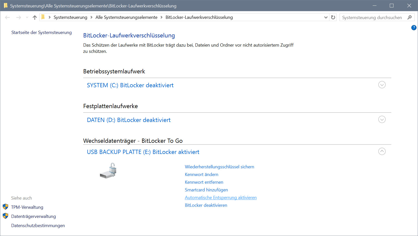 Über den Bitlocker-Einstellungen lässt sich die Platte leider auch nicht abmelden.