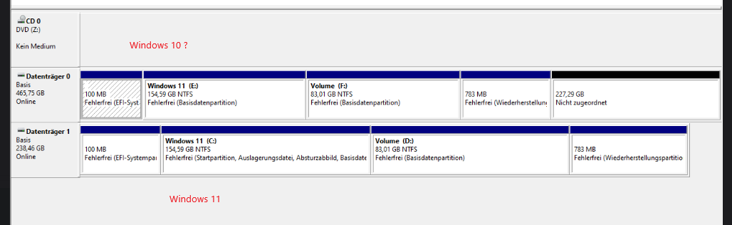 Sehe ich die Datenträgerverwaltung richtig, DT0 die, mit Windows 10, und DT1 die mit Windows 11 ist.Michele Halagar schrieb:Wenn noch Hinweise kommen sollten, wie E: zu vergrößern und F: zu verkleinern geht und ich das hin bekomme, werde ich es versuchen.