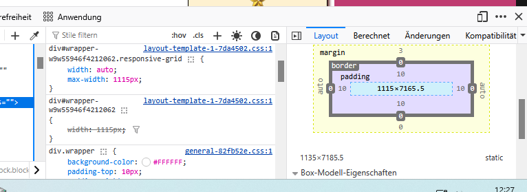Ich schaue mir eine Webseite auf dem desktop mit dem FF an und mache ganz außen einen Rechtsklick + "untersuchen". Es geht dann der Inspector unten auf. Rechts bekomme ich Infos zu dem div-wrapper, der den gesamten Content im body umspannt (wird ja oft so gemacht). Siehe screenshot: