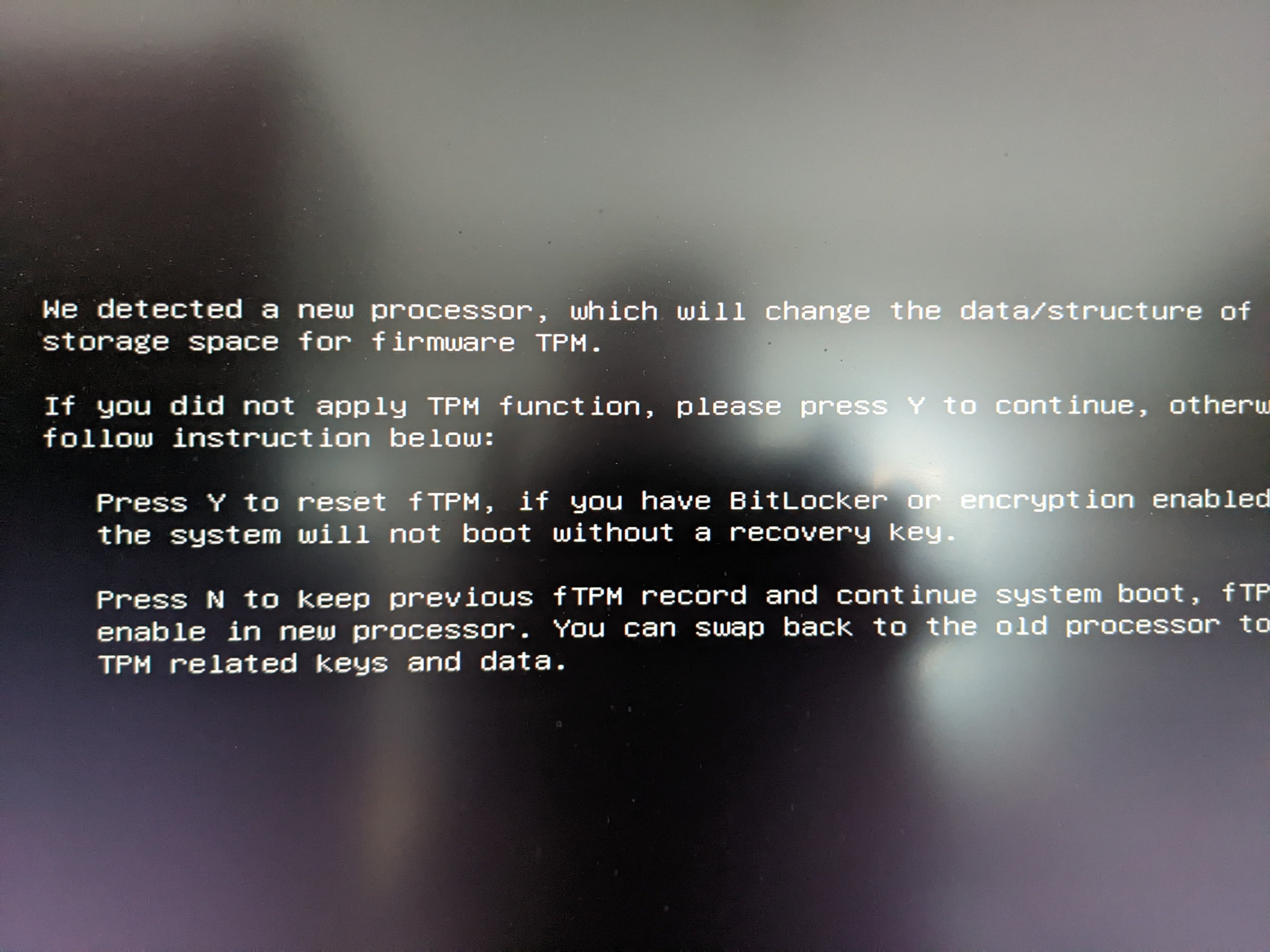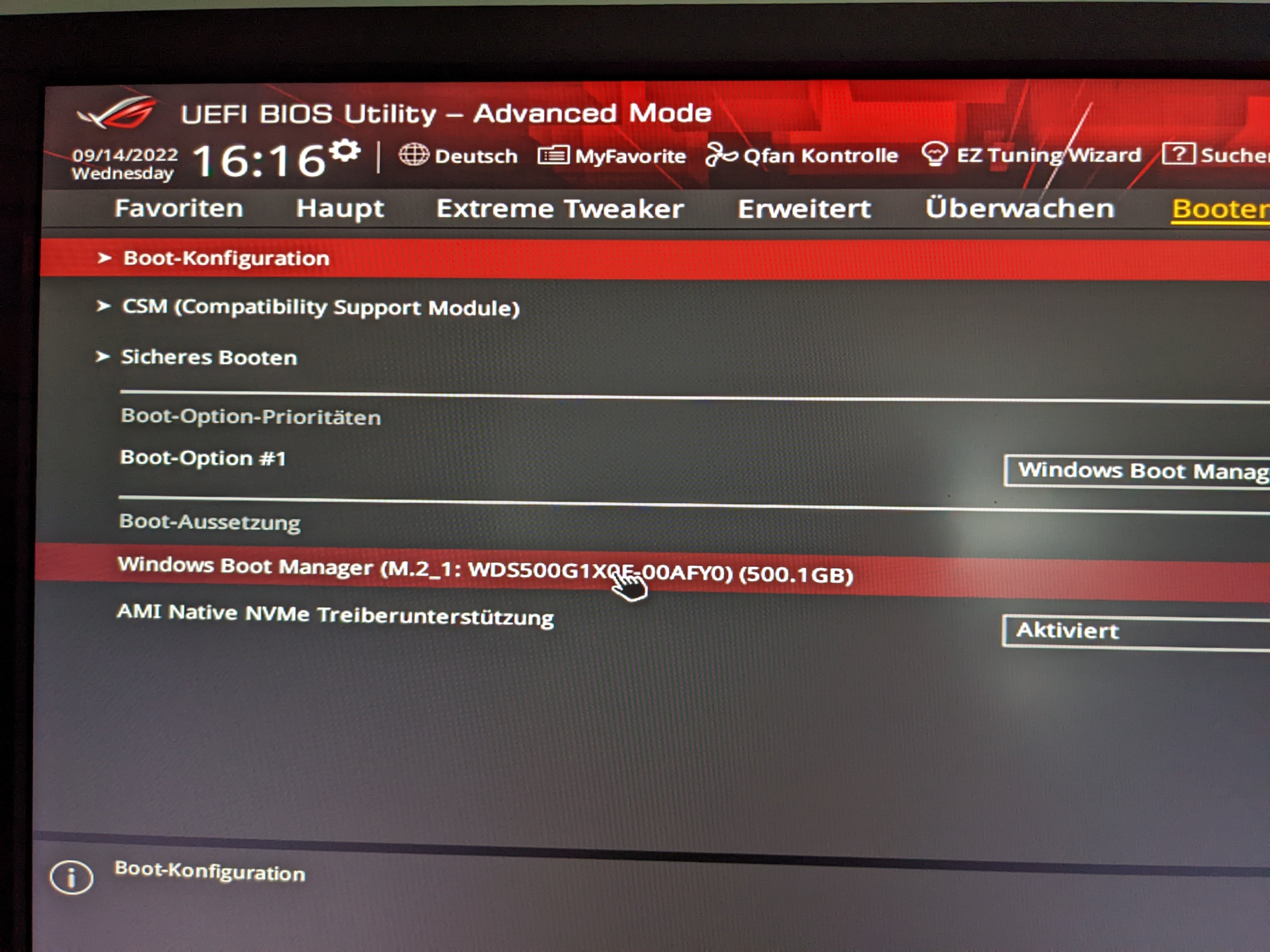 Soweit alles wie es soll und gut ist, aber mein System bootet leider nicht richtig! Wenn ich den PC starte erscheint das Bild aus meinem Anhang. Ich drück dann "N" und komme in mein Bios, dort muss ich dann in den Bootbereich und per Doppelklick meine M2 SSD anklicken - dann bootet Windows und ich bin auf meinem Desktop. Ich vermute das Problem liegt in dem fTPM, aber damit kenne ich mich nicht aus. Kann mir jemand Hilfe geben was ich ggf. im Bios verändern muss bzw. wo der "Hund" begraben sein könnte? Vielen Dank schon mal Vorab!