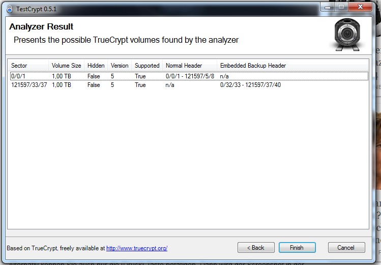 zu kaufen. Die Festplatte gibt auch wieder ihre gewohnten Laute von sich, jedoch wird sie nicht angezeigt im Explorer. Ich habe dann Computerverwaltung -> Datenträgerverwaltung gewählt. Dort wird der Teil der Festplatte, der mit TrueCrypt verschlüsselt ist, und eine Größe von 930 GB (von insgesamt 1000) hat, prinzipiell angezeigt, allerdings als "nicht zugeordnet". TrueCrypt findet sie prinzipiell ebenfalls, bringt aber eine Fehlermeldung ("Incorrect Password or no TrueCrypt Volume"). Soweit ich mich erinnere, zeigte TrueCrypt vor dem Ausfall der externen Festplatte noch einen weiteren Plattenteil an, der aber jetzt verschwunden ist. Nach meinen bisherigen Recherchen scheinen Informationen über Partitionen verschwunden zu sein. Gibt es eine Möglichkeit, noch auf die Daten zuzugreifen? Vieles würde ich nicht vermissen oder an anderer Stelle wieder bekommen. Jedoch habe ich unter anderem alle Fotos meiner Tochter seit Geburt auf der Platte. Einen Großteil davon hatte ich auch noch auf einem alten iPhone (3?), aber wie es der Zufall so will, hat es meine Frau geschafft, just vor einigen Tagen dieses zurückzusetzen beim Versuch, irgendeine App zu installieren, sodass die Bilder dort auch noch weg sind.