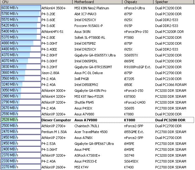 danke erstmal, habe das Prob gefunden. CL war noch zu hoch eingestellt und es war PC 2100 statt 3200. Trotzdem nun neue Benchmarks gemacht, aber irgendwie kommt mir das ganze immer noch nicht besonders schnell vor.