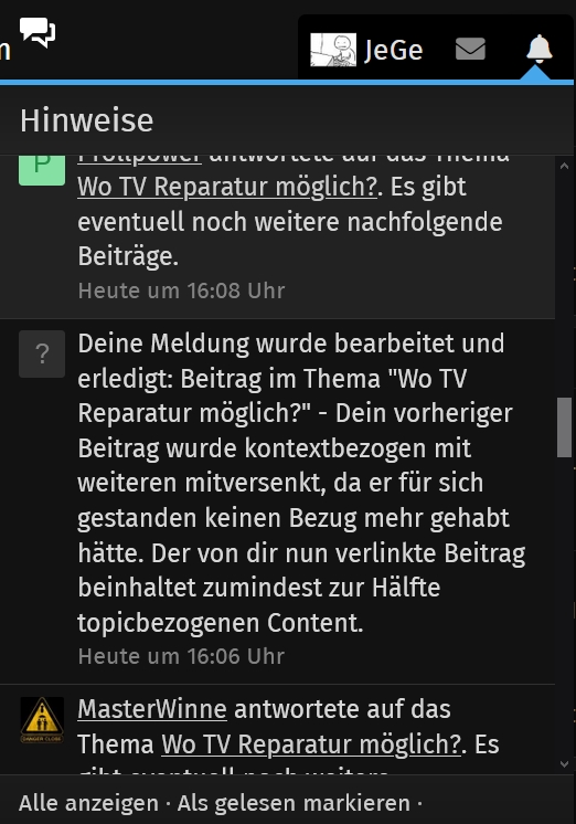 Meine 'Beitragshälfte' wird gelöscht - warum dann nicht auch die von mir beanstandete 'Beitragshälfte'?Deine Meldung wurde bearbeitet und erledigt: Beitrag im Thema "Wo TV Reparatur möglich?" - Dein vorheriger Beitrag wurde kontextbezogen mit weiteren mitversenkt, da er für sich gestanden keinen Bezug mehr gehabt hätte. Der von dir nun verlinkte Beitrag beinhaltet zumindest zur Hälfte topicbezogenen Content.