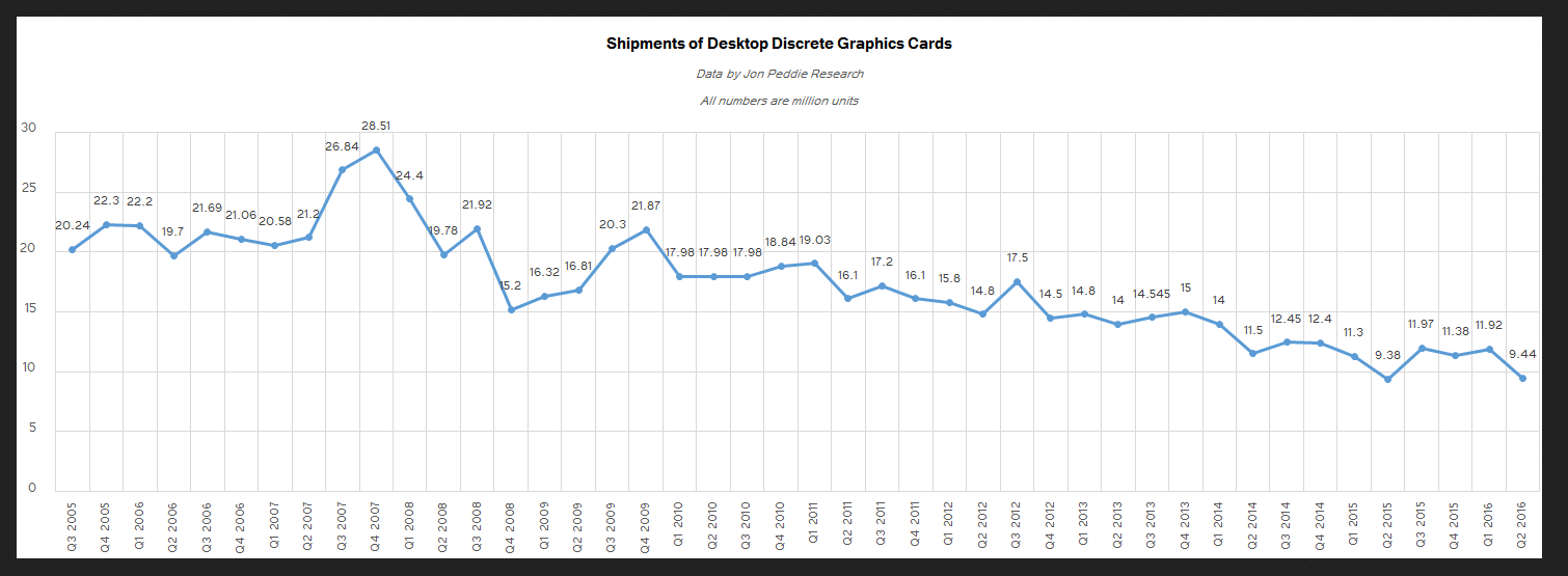 lynx007 schrieb:Auch wissen wir alle das der Markt an Dezidierten GPUs seit Jahren schrumpft. Der wird nicht plötzlich wieder explodieren und wachsen.... selbst zur Pandemie wo jeder eine GPU für zu hause brauchte, waren die Abverkäuft nicht größer als zum Millenium.