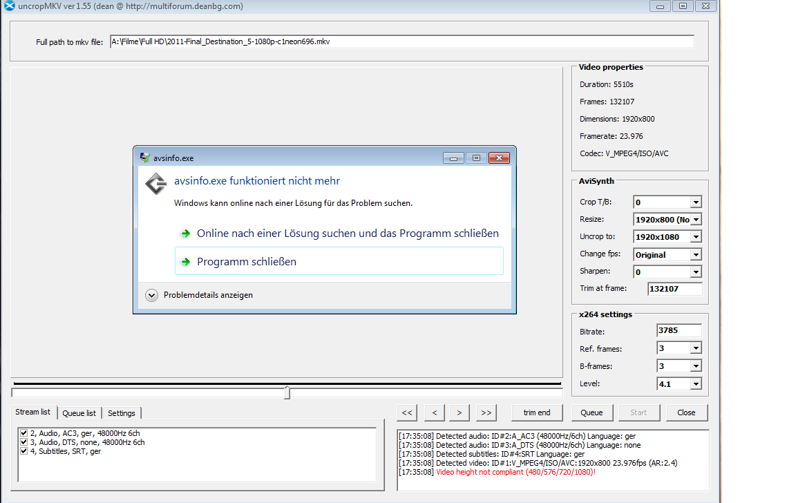 Da fand ich das Programm uncropMKV. Hab mir das Tool runtergeladen. Einen Film eingefügt, dann auf Memorystick kopiert. Danach gings auf dem TV. Dann dacht ich super! Doch keinen neuen TV kaufen. Am nächsten Tag wollte ich den nächsten Film anschauen. Film wieder eingefügt und jetzt kommt immer diese Problemmeldung: Hab ein Bild davon.