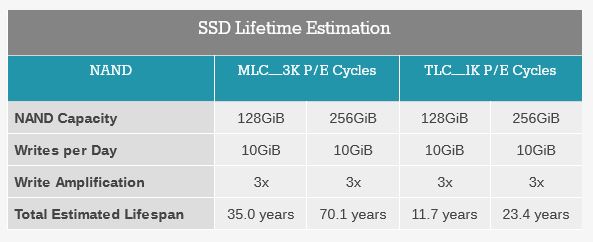 Trotzdem sollte man bedenken, dass ein normaler User nur so 2 bis 4TB im Jahr schreibt und selbst die Poweruser allenfalls auf 10TB im Jahr kommen. Das zeigt sich bei der Analyse der S.M.A.R.T. Werte vieler User hier und damit wären das 8 Jahre um diese 80TiB zu erreichen, so lange wird keiner die SSD nutzen, zumindest kein Poweruser und die kaufen auch keine 120GB SSD und schon eine 250er würde doppelt so viele Daten schreiben können, da diese sich ja auch mehr NAND verteilen, was dann 16 Jahre Nutzungsdauer wären.