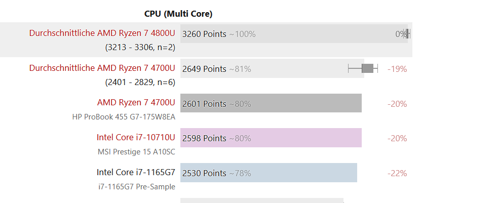 "Im CB20 Multi-Core-Test fällt der Core i7-1165G7 nur etwa 3 Prozent hinter dem Ryzen 7 4700U und dem Core i7-10710U zurück, während der Ryzen 5 4500U um 16 Prozent übertroffen werden kann. "