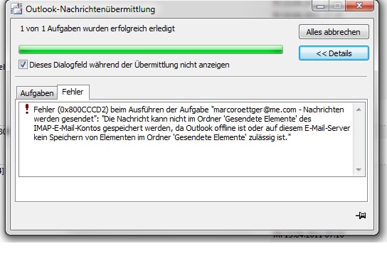 Ich kann die Mails auch ohne Probleme mit Outlook empfangen, nur wie gesagt der Versand geht nicht, da die Mails nicht gespeichert werden können im Ordner gesendete Objekte....Was muss ich machen?