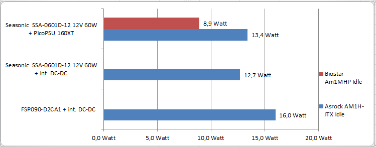 Ich habe die PicoPSU an beiden MBs getestet, der 19 V DC Wandler konnte natürlich nicht mit der PicoPSU betrieben werden, das 12 V NT hingegen lief auch mit dem 19 V fordernden ASRock-DC-DC Wandler. Bitte bei den Ergebnissen berücksichtigen, dass das ASrock @ 12V statt 19 V dann außerhalb der Spezifiktion läuft und ich niemanden den dauerhaften Betrieb in dieser Kombination empfehle. Dadurch konnte ich beim ASRock bis zu 3 Varianten Testen, beim Biostar hingegen nur eine. Aber diese Variante wurde bei beiden Plattformen durchgeführt (Seassonic + PicoPSU), kein Netzwerkkabel gesteckt, kein Sound angeschlossen.