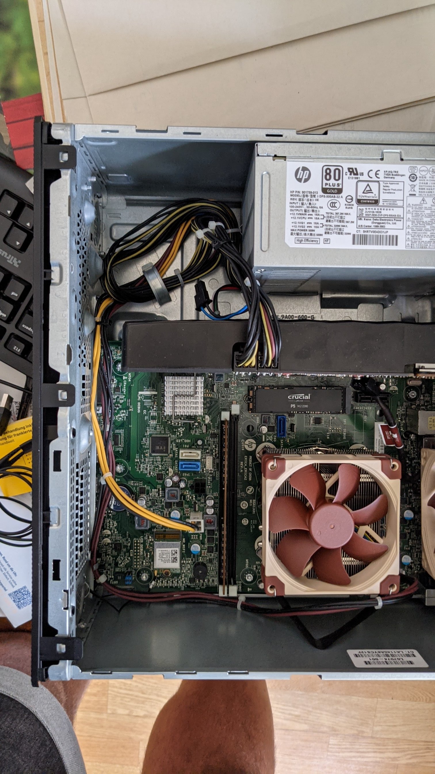 Das auch bei mir verbaute HP Erica Mainboard hat nicht nur 2x 12V 4-Pin anstatt die gängigen 20/24-Pin als Stromanschluss, sondern auch den 1151-Kühlersockel trotz AM4-CPU Sockel.