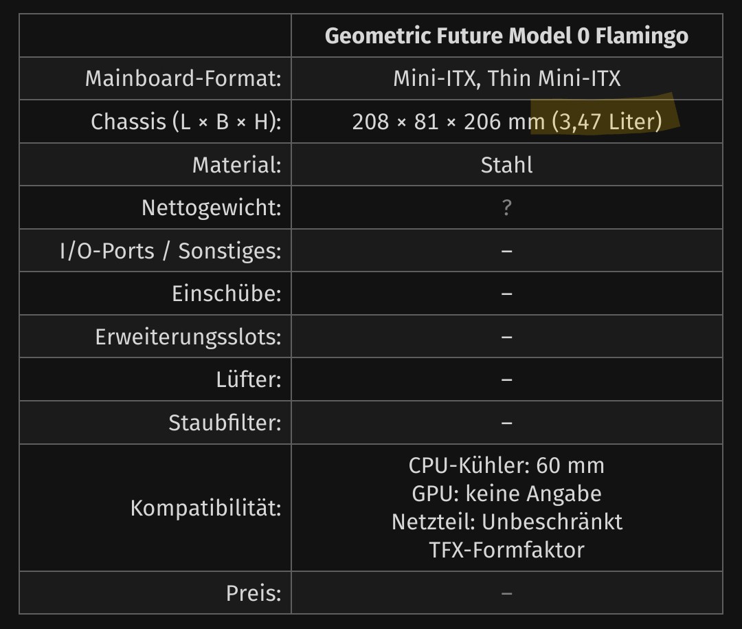 mein dan a4 hat 7,5l, wobei da zusätzlich zu einem 3700x noch eine rx6750 drin ist. vom prinzip das gleiche und das läuft auch. die ganzen deskminis, minisforums und mac minis sind ja auch nicht abgeraucht.tomgit schrieb:Naja, Butter bei die Fische: Würdest du moderne Hardware in diesem Gehäuseverheizenverbauen wollen?![]()
