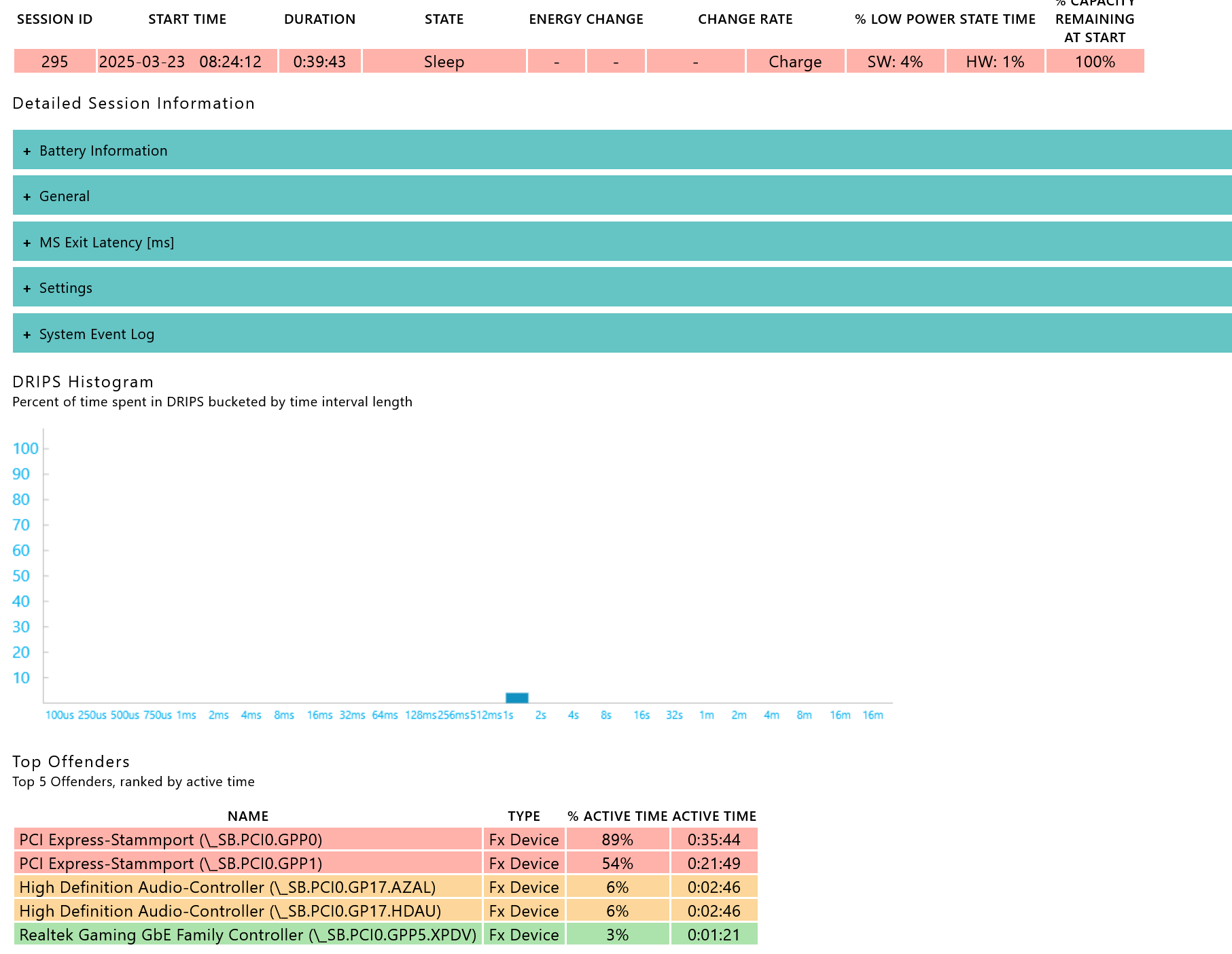 Meine Lüfter im S0 modern standby sind lauter als im Idle Betrieb, gehen meist für 1 min an, dann ggfs. 30 sek Ruhe und von vorn. Ich habe alle powercfg wake_armed ausgeschaltet (es war nur der GBE-Controller an), habe den Alarm-Geber in den Energieeinstellungen ausgeschaltet, habe im Bios geschaut, ob dort noch etwas an ist (dort war laden im S4/S5 an). Ich schalte sogar die Maus vorher aus, weil die hybersensibel das Notebook wieder aufweckt. Es bleibt laut Sleepstudy im sleep für die Zeit und watcht nicht auf.