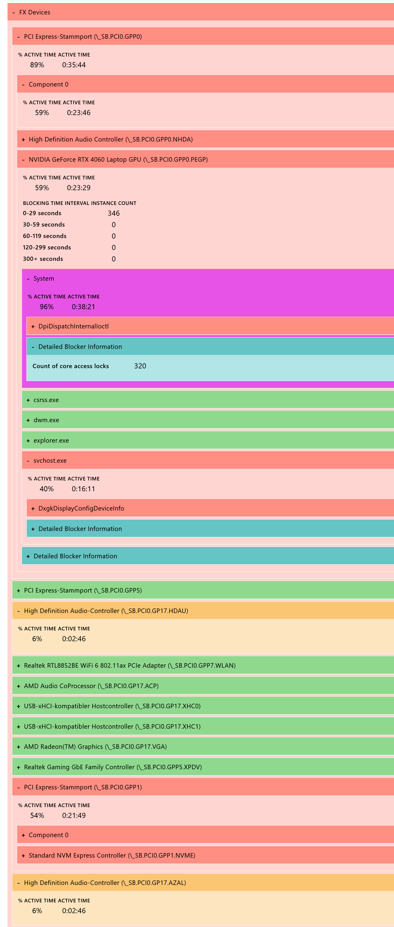 Die Grafikkarte hat fast die ganze Zeit "DpiDispatchInternalIoctl" angehabt bzw. über die svchost die DxgkDisplayConfigDeviceInfo.