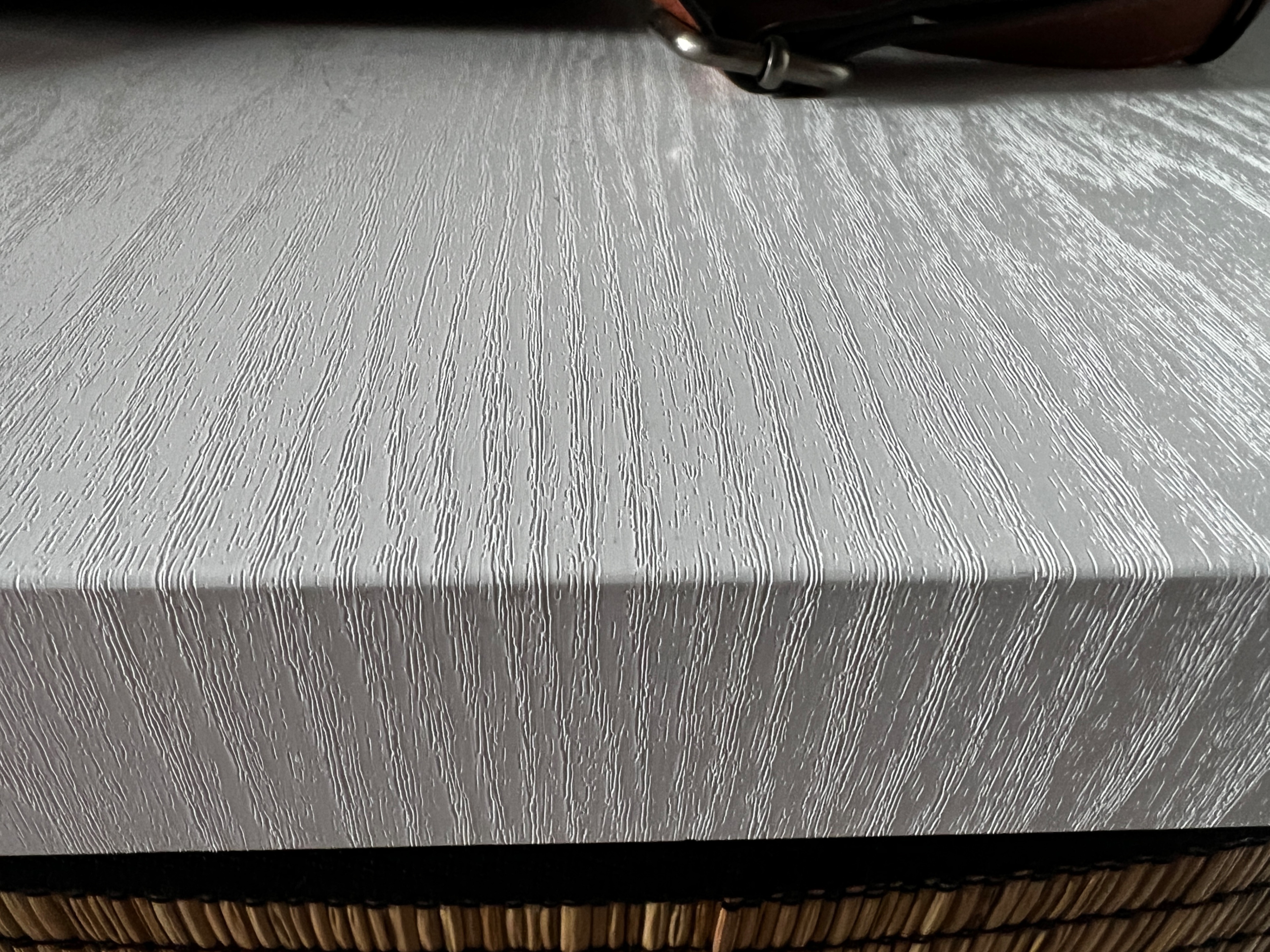 Jetzt spiele ich mit dem Gedanken, die Platte mit einer halbwegs hochwertigen Folie zu bekleben (z. B. in Holzoptik oder was Schlichtes). Damit könnte man die Optik verbessern und die Lebensdauer vielleicht noch um ein paar Jahre verlängern.