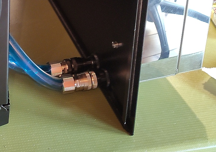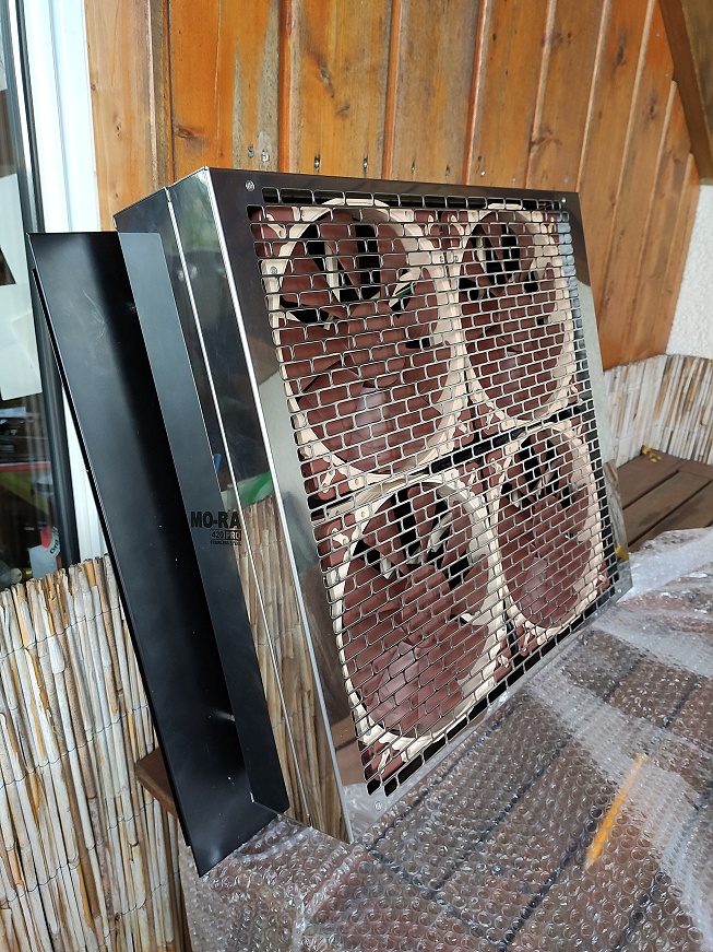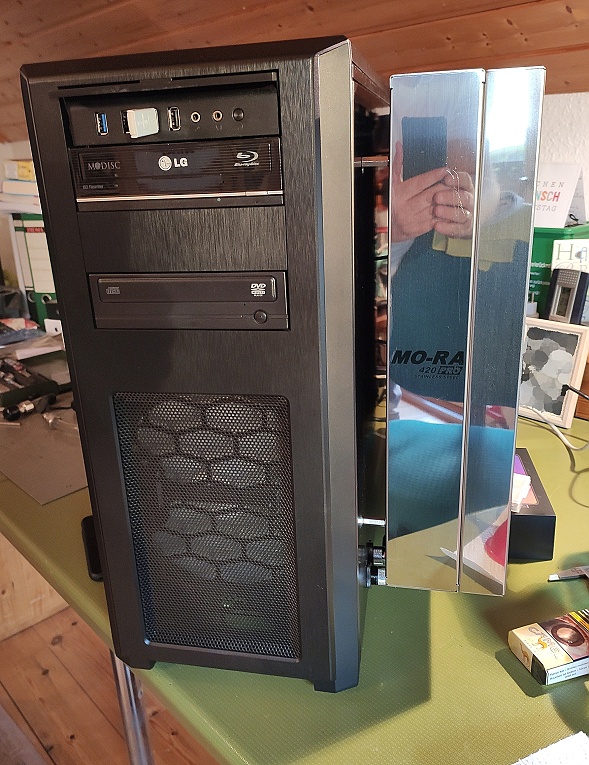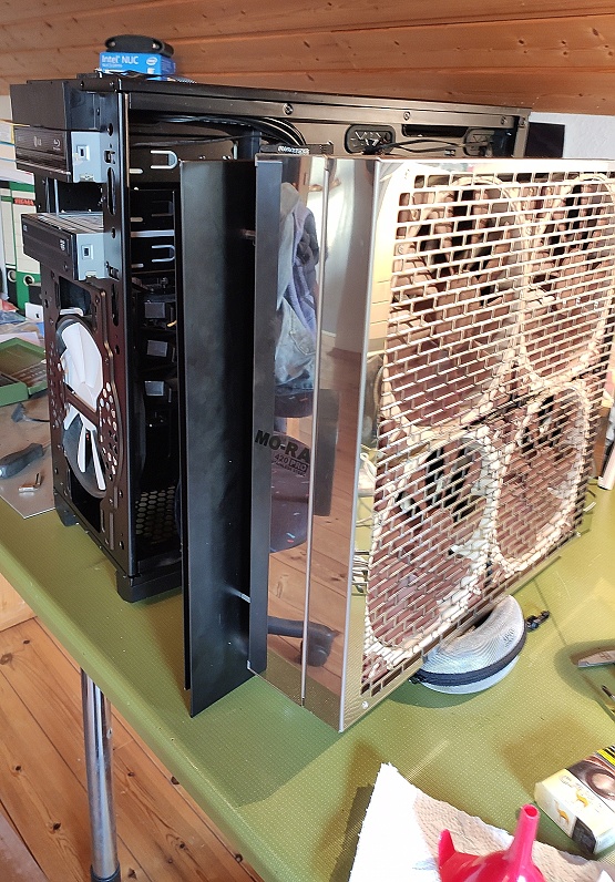 Meinen Mora420 habe ich extern am Gehäuse befestigt, über Schnellverschlüsse in der Seitenwand trennbar.