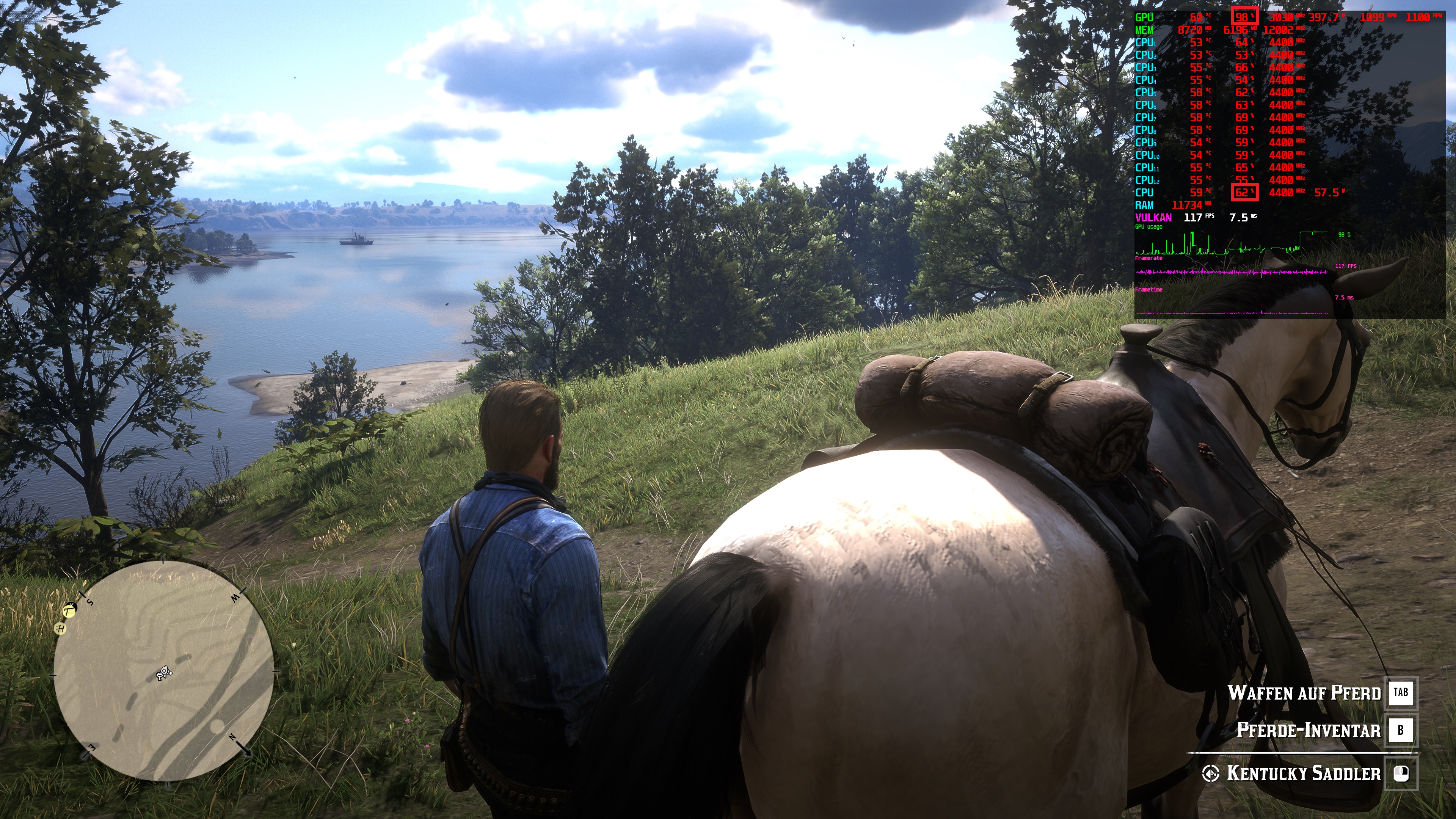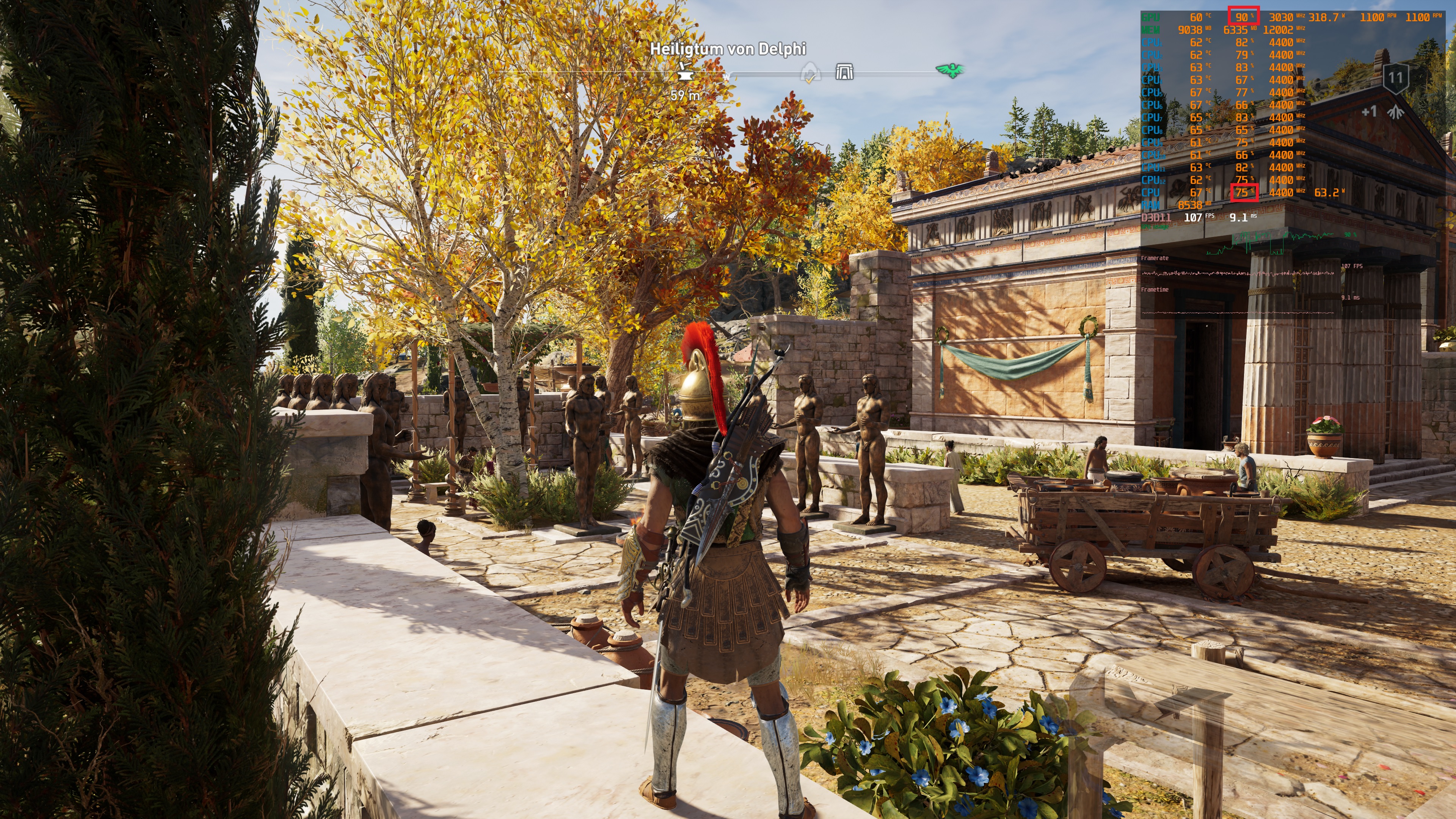 Hier mal ein paar Zahlen aus Assassin's Creed Odyssey ingame, im Hintergrund etwas merkwürdige Darstellung aufgrund HDR (GPU habe ich manuell übertaktet):