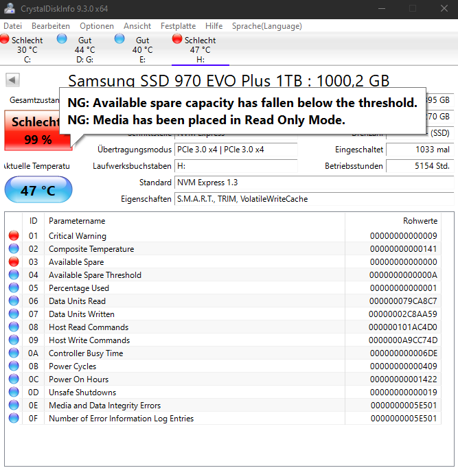 Mein PC frierte plötzlich ein. Computer runtergefahren , nach dem Bootvorgang , Fehlermeldung : Fehler in der Registry. Über Windows 11 Bootstick alles versucht. Systemwiderherstellung, Diskpart löschen usw und danach über Samsung Erase Bootstick erstellt und versucht komplett zu löschen. Erkannte die Evo aber konnte sie auch nicht löschen. Defekt oder kann ich noch was machen ?