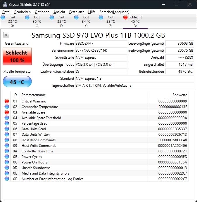 Samsung Magician zeigt an das der Laufwerkszustand bei 10.7 TB Geschrieben kritisch ist.
