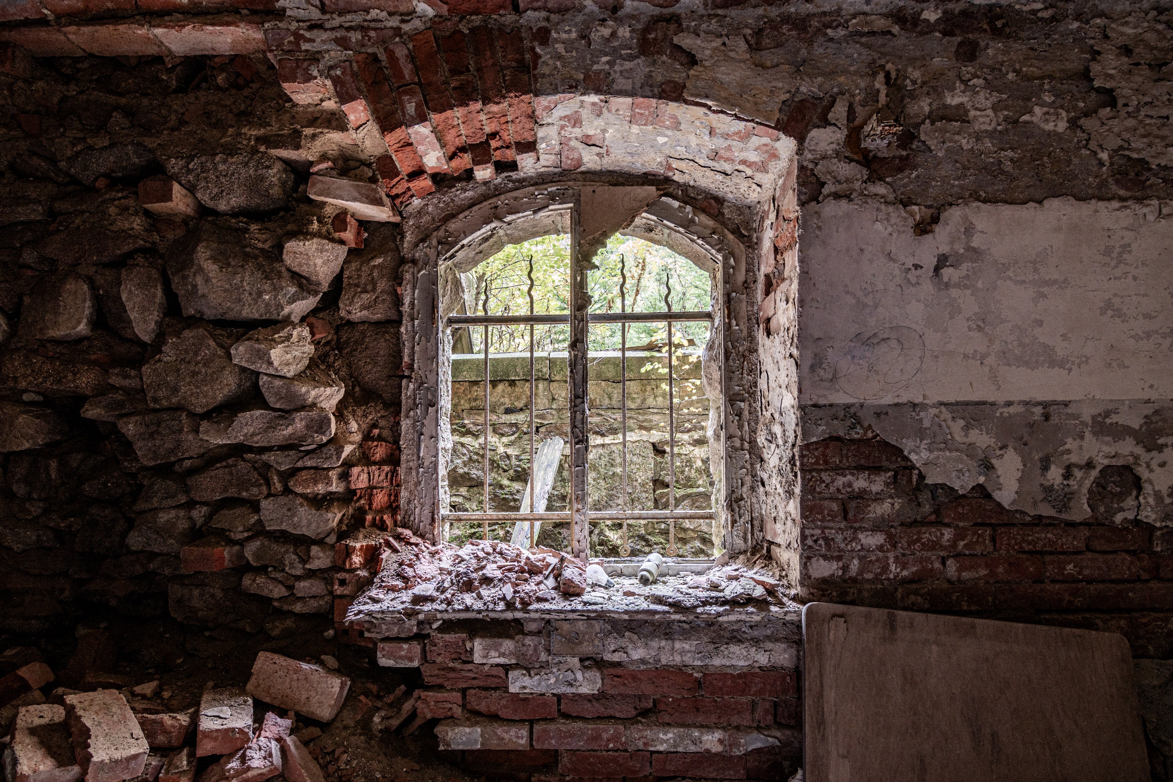 Bild 8: Lost Place, Ruine, Zerfall, draußen ist alles schön grün, aber eher weniger Zerbrechlichkeit. Immerhin ausgewogen belichtet, ich hätte es vielleicht etwas dunkler gemacht, damit das Grün draußen nicht leicht überbelichtet ist, aber das ist wirklich schwierig, ohne dass dann vorne was absäuft. Mir fehlt da als Gegensatz eine hübsche Person in der Tür und/oder auf dem Sessel sitzend, dann wäre was da, wo man länger hingucken könnte. Vielleicht noch mal hinfahren, mit Frau/Freundin/Tochter/Bekannte im roten Kleind/Mantel, mit auffälligem Hut, oder so ...