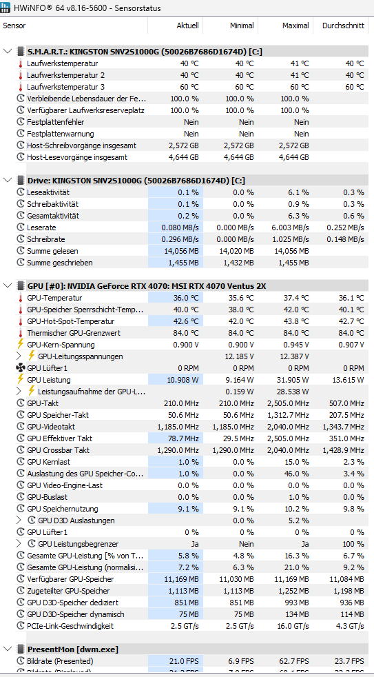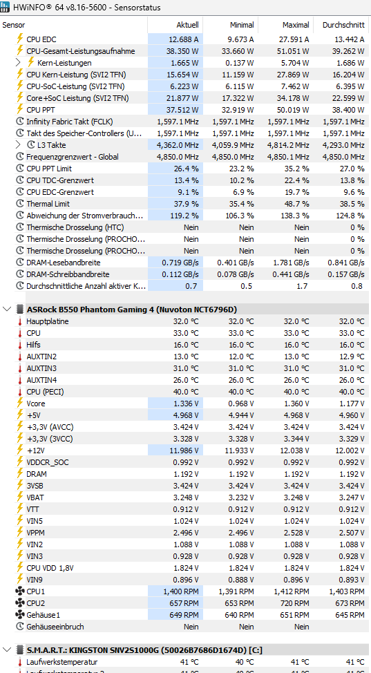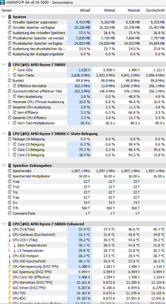 Angehängt sind paar Infos von HWInfo. Mir fällt da nichts besonderes auf. Ich habe außerdem einen CPU-Stresstest über Prime95 für circa 30 Minuten gemacht und ich hatte keine Fehlermeldungen, alles lief super. Ich bin mit meinem Latein am Ende...das Problem tritt halt nur beim Zocken auf.