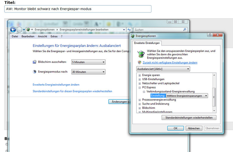 wenn ich meinen PC aus dem Energiespar-modus wieder an-"klicke" (per maustaste) bleibt der Monitor schwarz. Das ist so, seitdem ich eine PCI-Grafikkarte eingesteckt habe, d.h. mit der onboard-karte hatte der Monitor nach der Vorgehensweise ein Signal. Scheint fast so, als wäre der Steckplatz aus dem Energiespar-modus heraus nicht aktiv. Nach Neustart ist wieder alles gut. Was kann man da machen?
