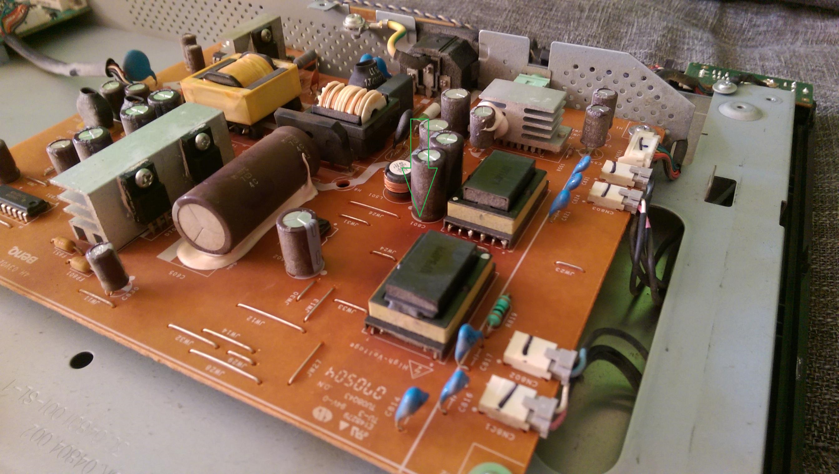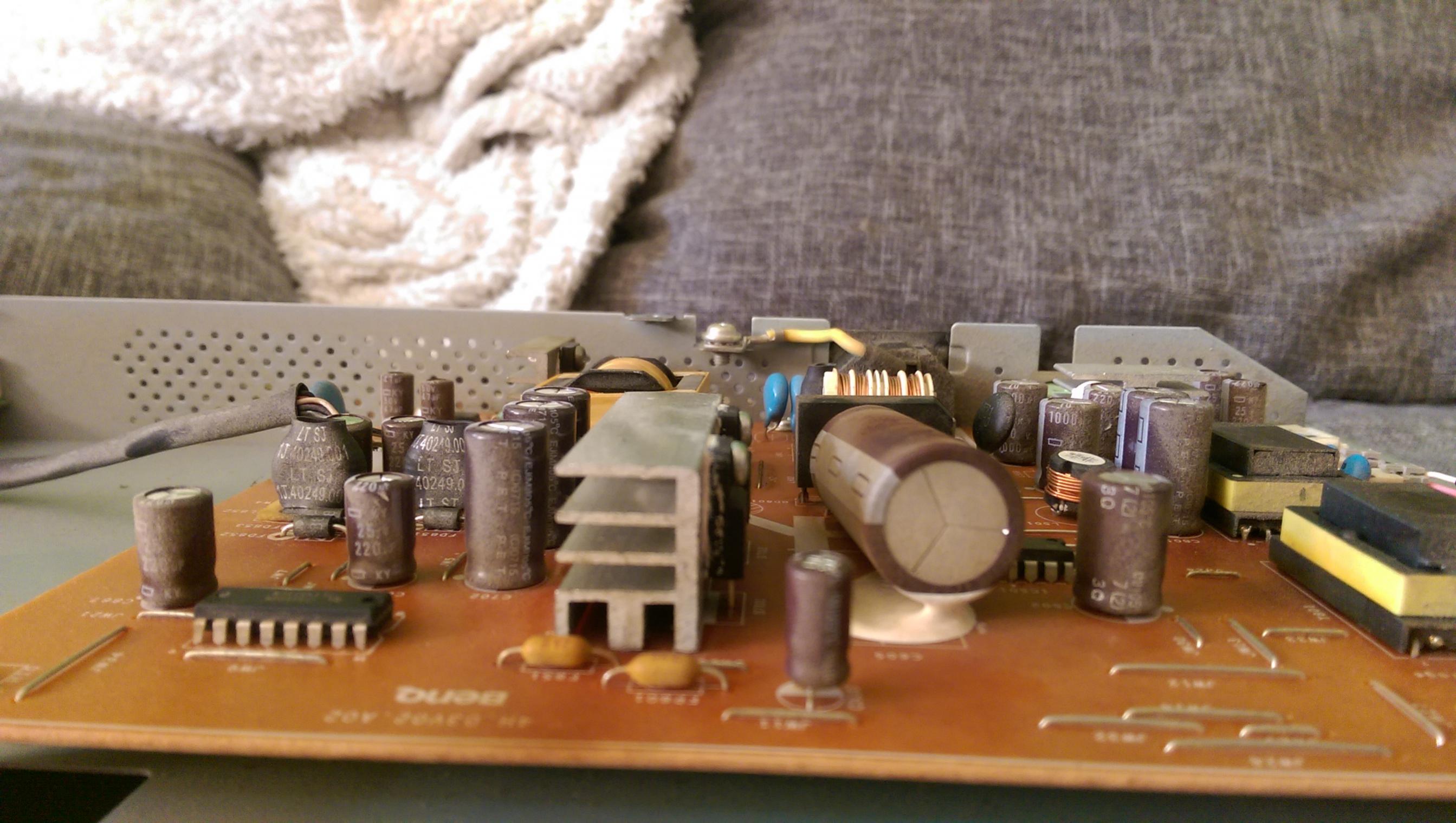 Erst eine weile flackern. Dann abschaltung. Jetzt geht er nur noch eine weile bei ganz niedriger helligkeit. Hab ihn schon geöffnet um zu sehen ob die kondensatoren gewölbt sind aber nix zu sehen. Aber sone weiße paste an zwei kondensatoren weiss. Nicht was die soll.
