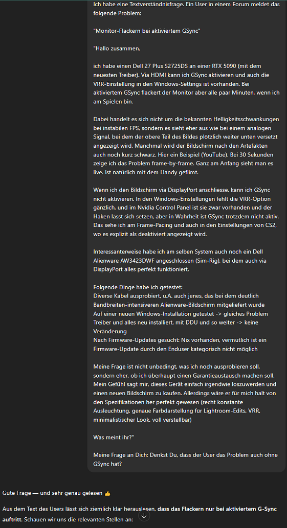 ich habe einen Dell 27 Plus S2725DS an einer RTX 5090 (mit dem neuesten Treiber). Via HDMI kann ich GSync aktivieren und auch die VRR-Einstellung in den Windows-Settings ist vorhanden. Bei aktiviertem GSync flackert der Monitor aber alle paar Minuten, wenn ich am Spielen bin.
