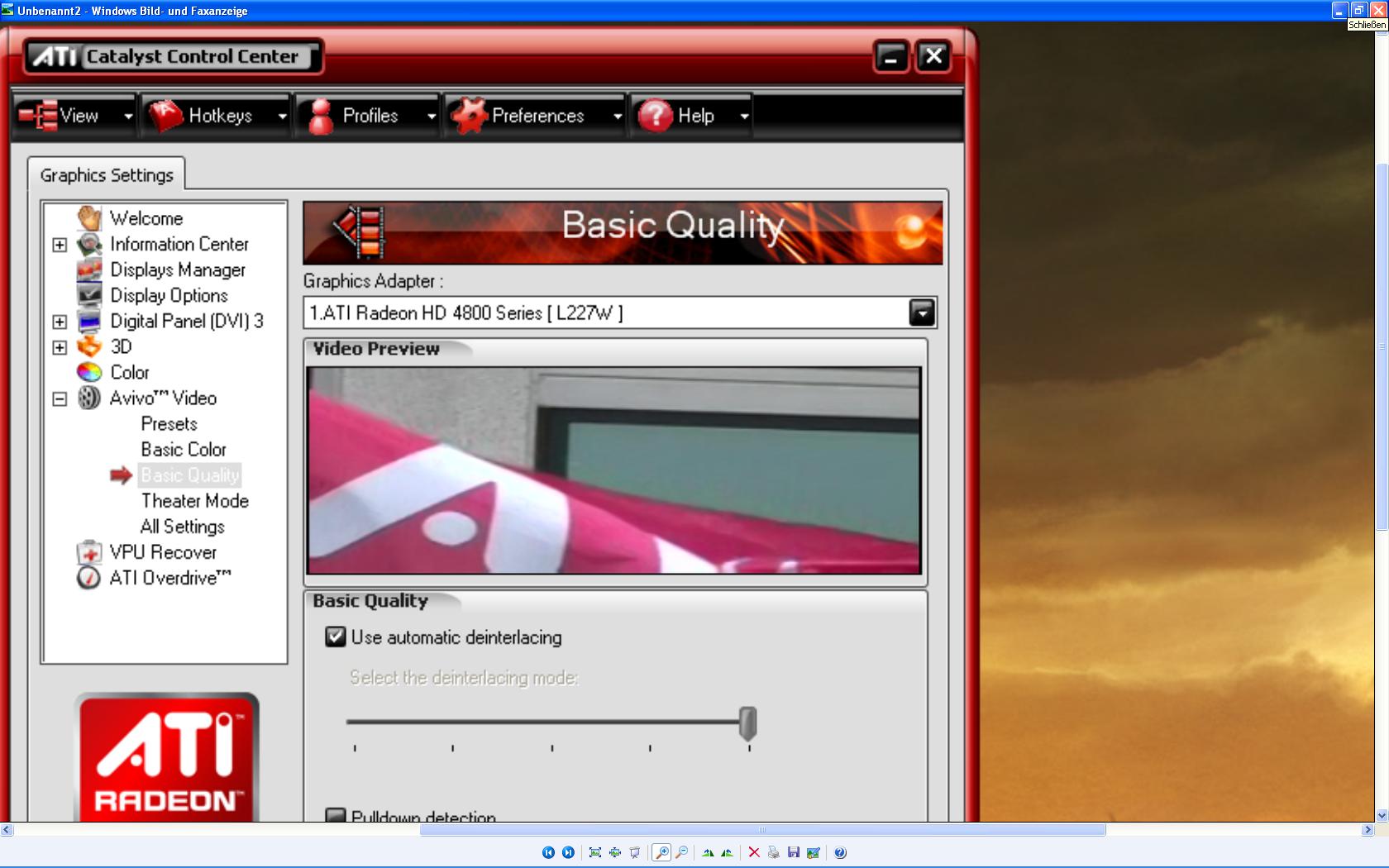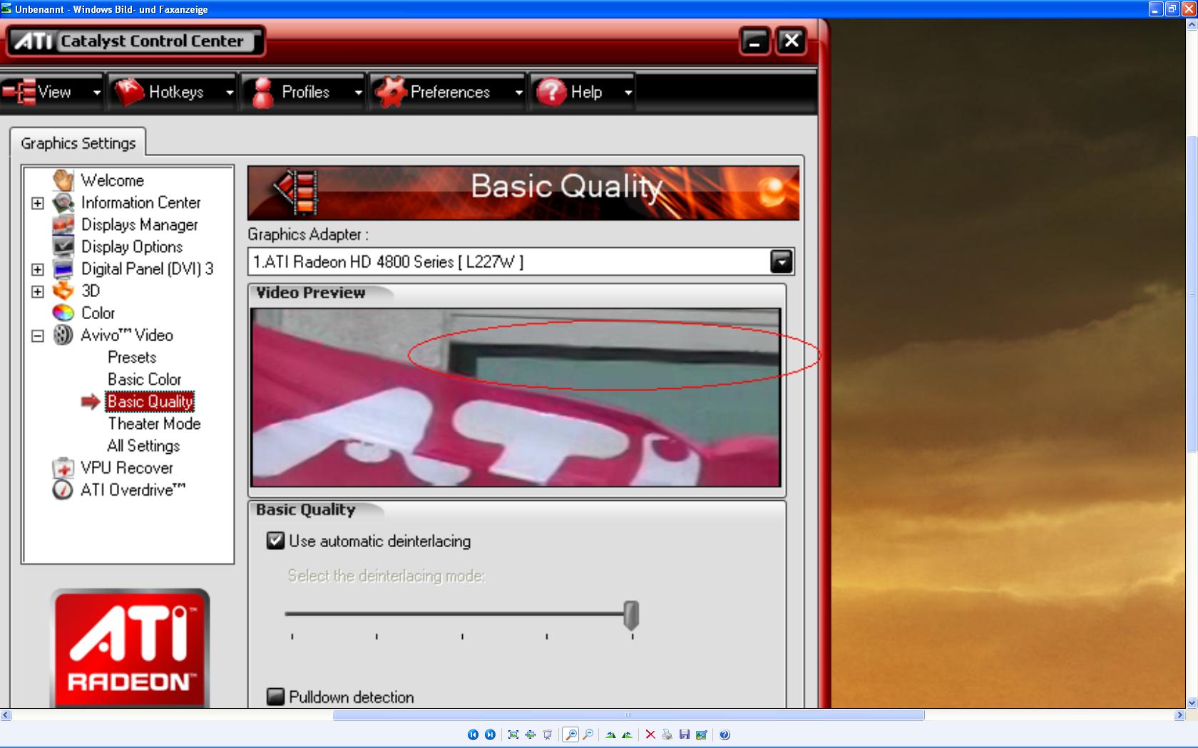 hatte mir mal eine LG 227WT gekauft. Ich hatte mal gemerkt, dass der Monitor an pixeligen Texturen flimmert aber nur an der stelle. Hatte vorher eine Geforce 8400 GS drinne jetzt hab ich eine Sapphire HD 4870 1GB drinne. Dachte halt es würde an der Graka liegen und ich hatte dort sowieso schon die Graka von ATI bestellt. Es ist immernoch nicht weg will aber nicht die Hoffnung aufgeben, dass es vll an Einstellungen liegen kann. Also hier hab ich mal Bilder wo man das bei CCC an einer Videosequenz sieht einer Flagge die halt sich hin und her bewegt.