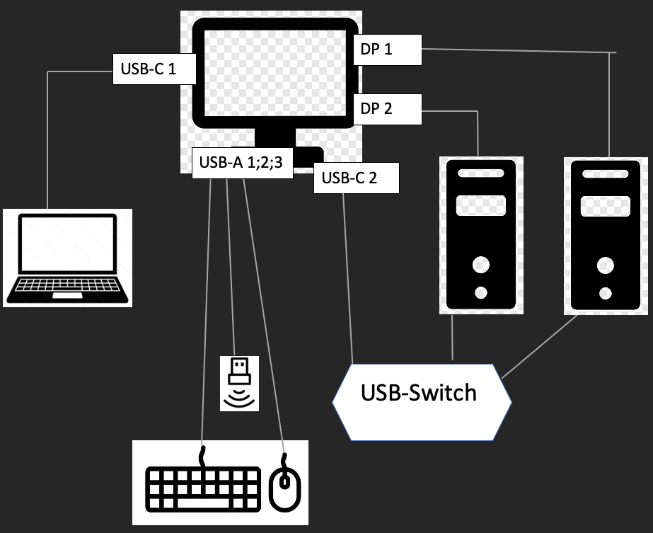 - Welche Anschlüsse werden benötigt? (Displayport, HDMI, DVI usw.) 2x DP, 1x USB-C