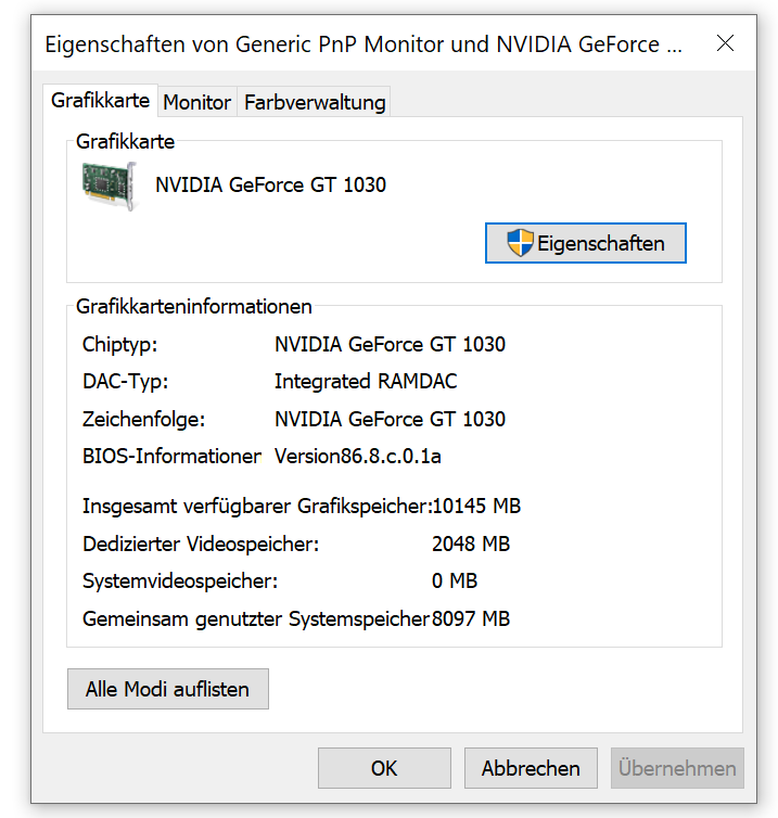 Die GT1030 ist eingebaut. Habe keinen passenden Nvidia Treiber installiert, da ich keinen gefunden habe. Diese alte Karte taucht auf der Nvidia Seite gar nicht mehr auf. Die Karte läuft jetzt mit irgendeinem Windows-Treiber. Weiss nicht, ob das ein Problem ist?