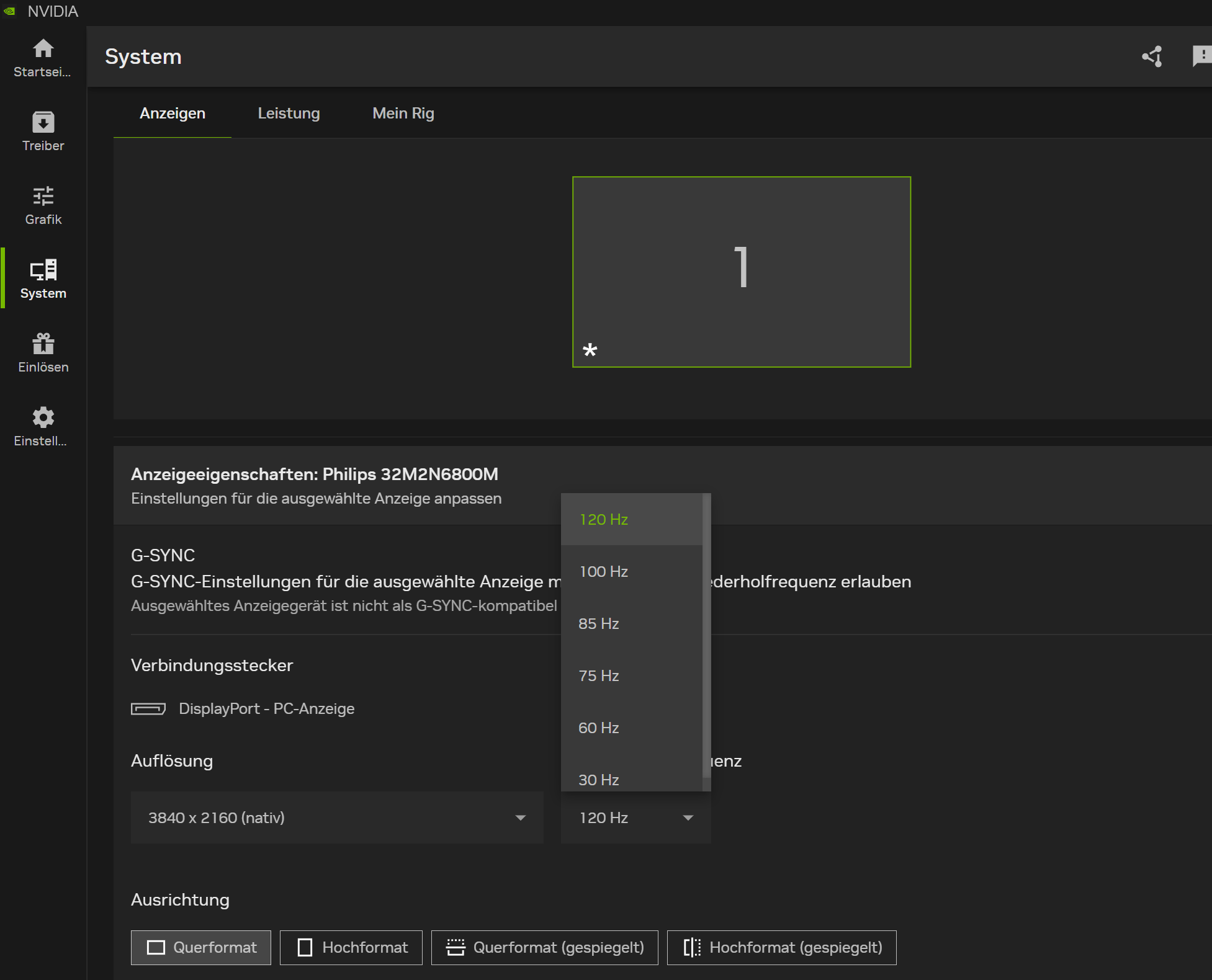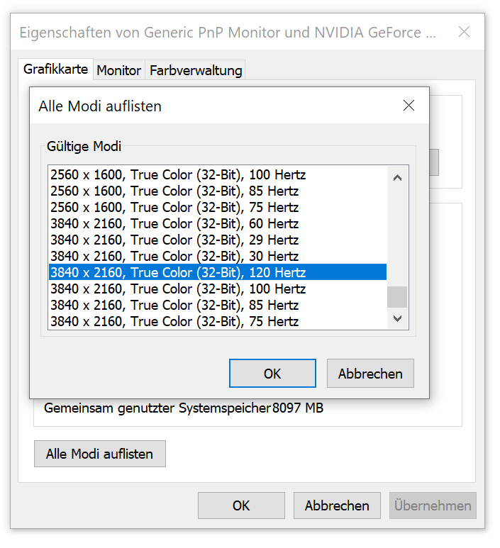 Mit Rechtsklick auf Desktop kann ich in die "NVIDIA Systemsteuerung" kommen. Meinst Du das? Hier ein Bild daraus, ich bin auf 120 Hz. limitiert in der Einstellung.