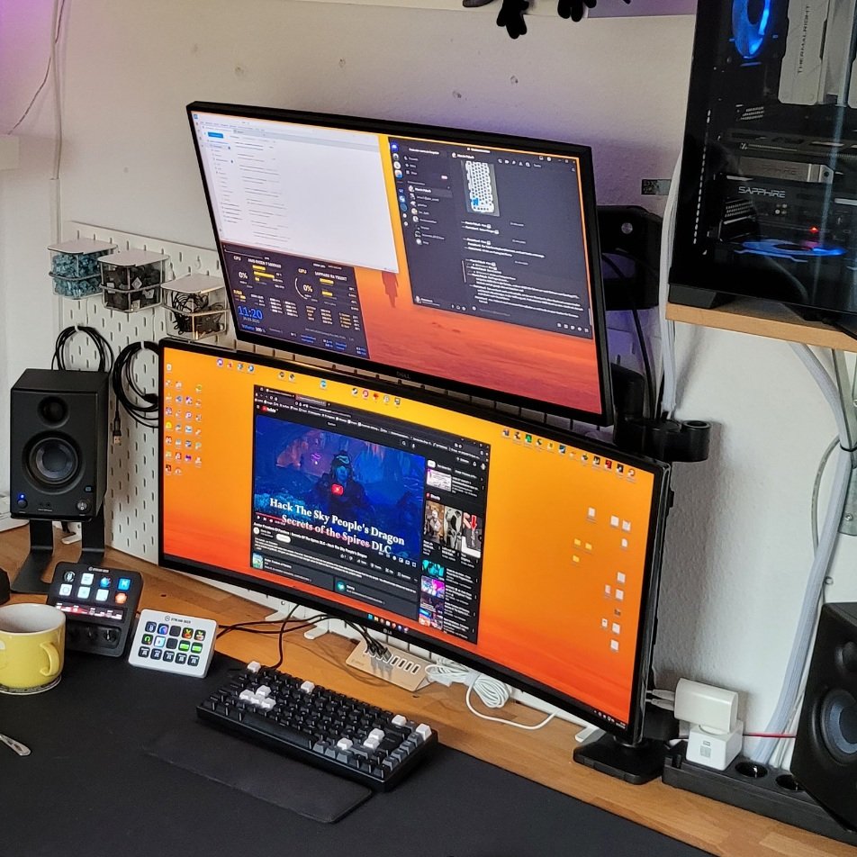 Ich habe hier ein 2 Monitor-Setup. Unten einen 49Zoll Curved und oben einen 27Zoll non Curved.