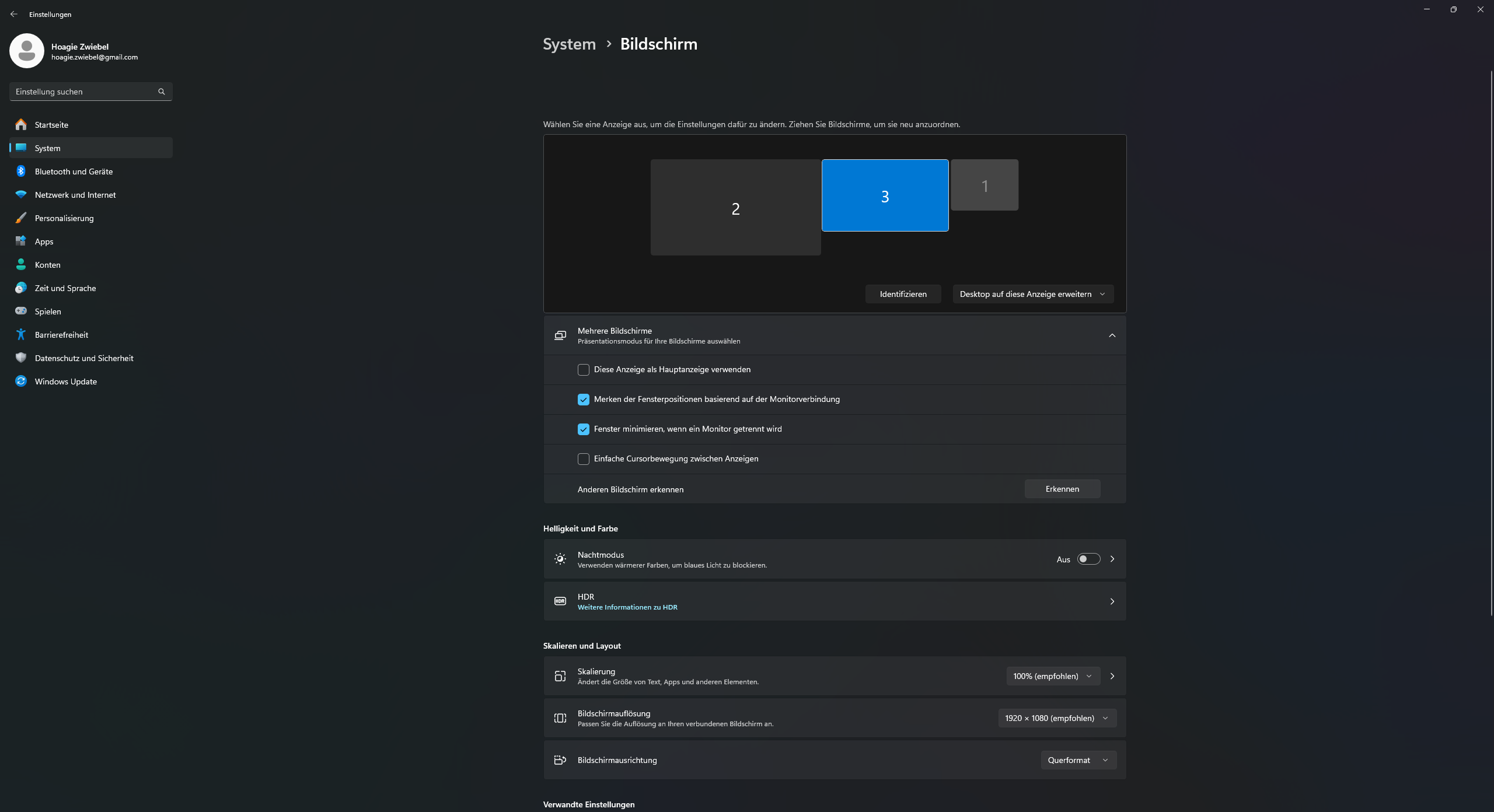 Die auf den Bildern gezeigte Nummerierung der Monitore ist korrekt, wie es sonst auch der Fall ist (1=Hauptmonitor, 2=2. Monitor, 3.=3. Monitor). Die Anordnung stimmt allerdings nicht. Der Hauptmonitor wäre eigentlich in der Mitte. Die Option "Verbindung mit dieser Anzeige trennen" wurde automatisch reingeladen, stammt also nicht von mir. Diese zu ändern bringt allerdings auch nichts, da mein PC danach einige Minuten lang einfriert und sich anschließend entweder rein gar nichts ändert, oder ich die Fehlermeldung auf meinem Foto bekomme.