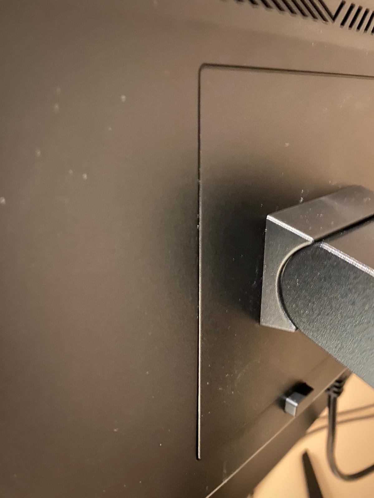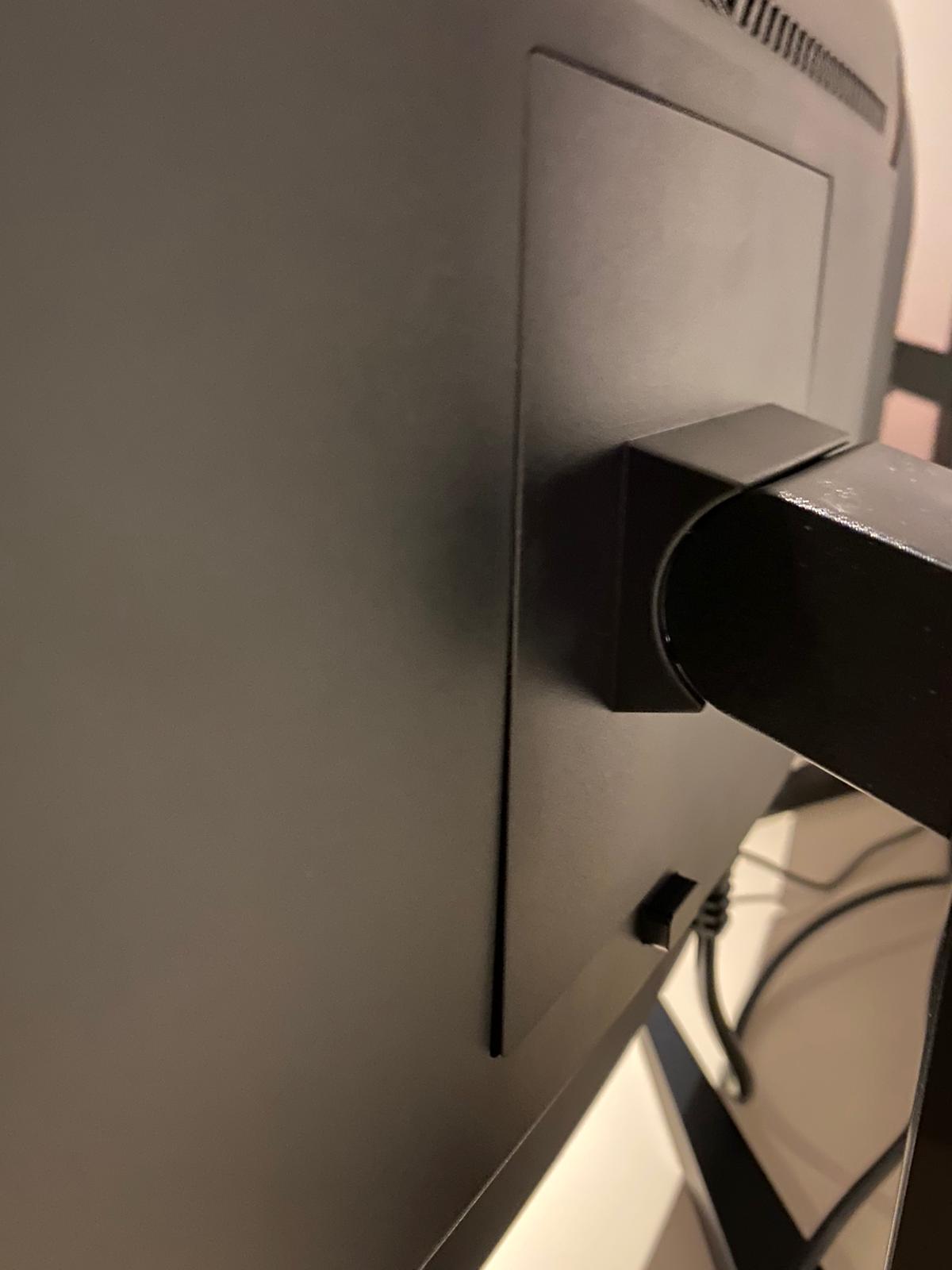 Mal abgesehen davon, dass von einem Monitor der Displayport-Kabel defekt war, ist mir bei einem der beiden Monitore aufgefallen, dass der Standfuß knackt, wenn ich den Monitor nach hinten neige. Beim anderen Monitor ist das nicht der Fall. Wenn ich die beiden Monitore miteinander vergleiche von hinten, dann fällt auch auf, dass beim einen Standfuß die Einharkung zum Monitor ein bisschen mehr herausragt, als beim anderen (siehe Bild).