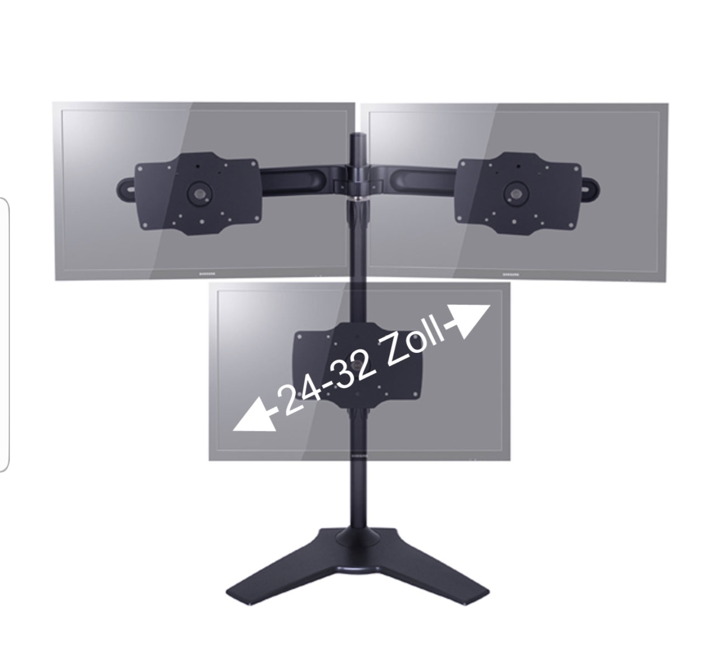 Mittig unten soll mein 27 Zoll hin und oben die zwei 24 Zoll. Aktuell hätte ich einen Ricoo TS5911 probiert, der passt nicht, weil ich doe oberen Monitore nicht hoch genug hängen kann.
