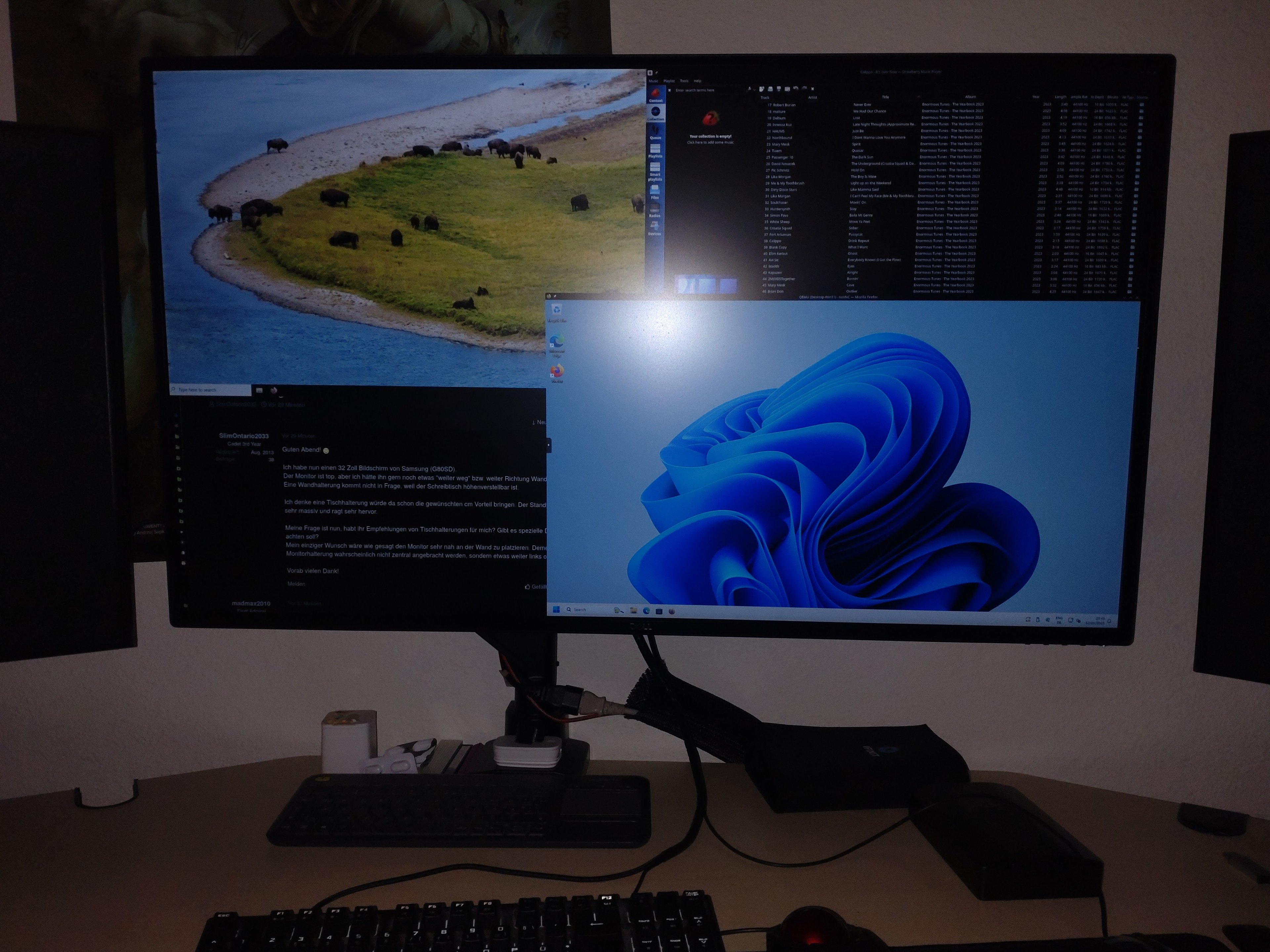 Mein einziger Wunsch wäre wie gesagt den Monitor sehr nah an der Wand zu platzieren. Dementsprechend sollte die Monitorhalterung wahrscheinlich nicht zentral angebracht werden, sondern etwas weiter links oder rechts (?).