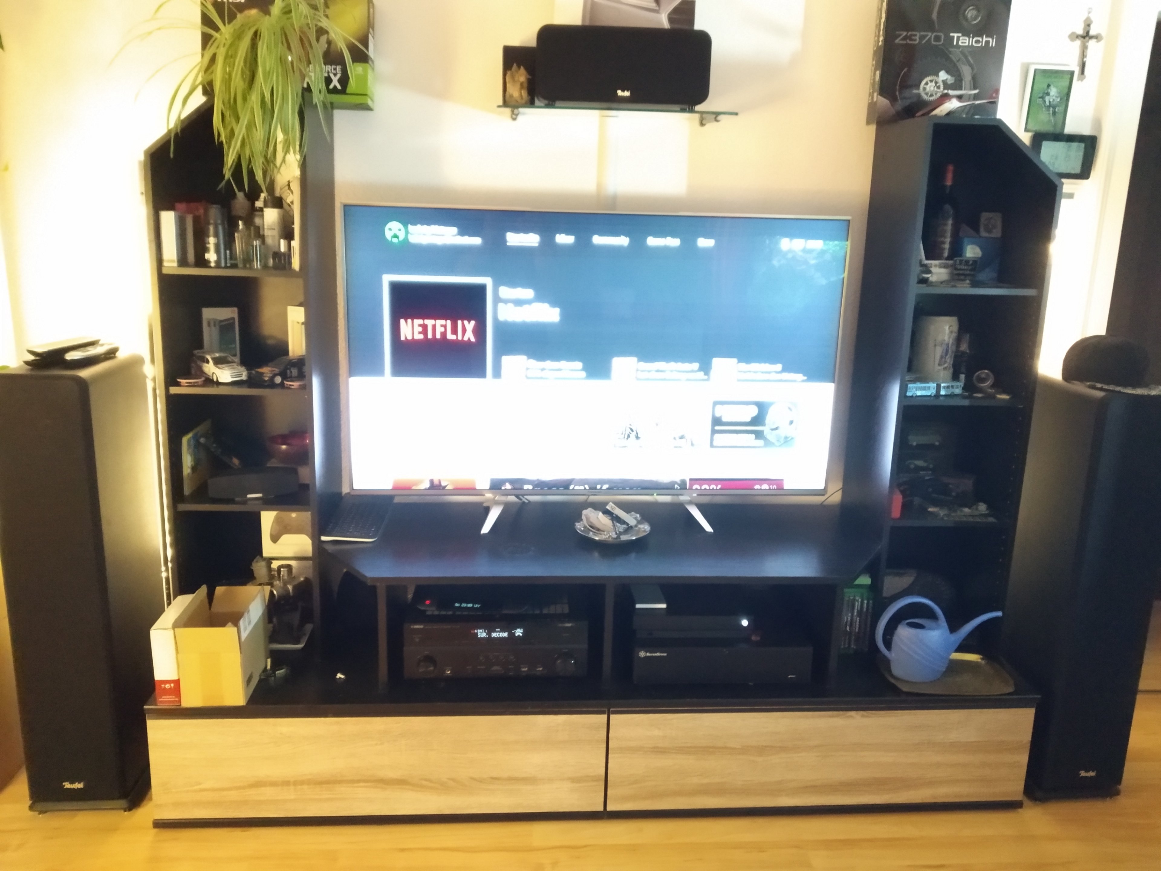 Steht der Sub vorne, fällt die Reflektion an der Vorderwand weg. D.h. es gibt den Einbruch bei 60hz nicht mehr, dafür wird aber die Mode bei 50Hz voll angeregt. Bringt auf jeden Fall deutlich mehr Bass. Ob es zuviel nachschwingt/wummert musst du sehen. Je nachdem wie weit rechts oder links der Sub dann steht, werden die Einbrüche durch die Seitenwände ausfallen. Ich vermute, dass eine Position irgendwo jenseits der Mitte ein ausgewogeneres Ergebnis bringt. Musst du aber sehen wie genau das an den möglichen Positionen ist. Genauso kann es was bringen wenn du den Sub in eins der höheren Fächer stellst.