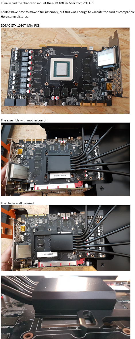 Ich muss hier mal eine Lanze für Monsterlabo brechen. Bevor das erste Gehäuse überhaupt rauskam, habe ich persönlich angefragt ob denn meine Zotac 1080Ti Mini kompatibel sei. Antwort: Karte nicht vorhanden aber wir bestellen eine. Eine paar Wochen später habe ich Bilder vom Einbau des Kühlers bekommen.