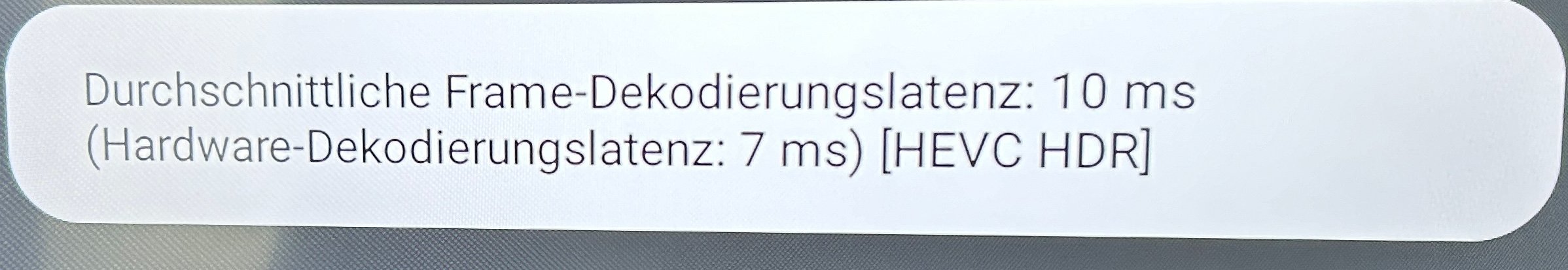 Auf dem Fernseher bekomme ich als Zusammenfassung den Screenshot 1 unten angezeigt. In 1440p ohne HDR liegt diese bei "Durchschnittliche Frame-Dekodierungslatenz: 10 ms; Hardware-Dekodierungslatenz: 7 ms).